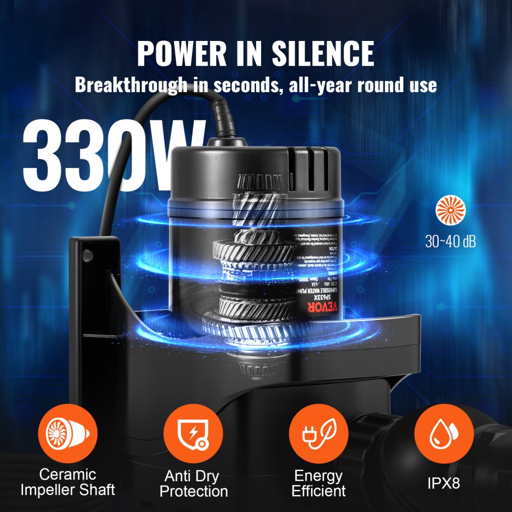Ensure a steady flow of water while reducing energy consumption with this efficient 330W submersible pond pump Capable of lifting water to a height of 22 feet, it delivers an impressive flow rate of 4000 gallons per hour for optimal circulation in larger water bodies Operating quietly at a noise level of 30-40dB, this pump is designed for continuous use around the clock and features a built-in heat-overload sensor for added safety.