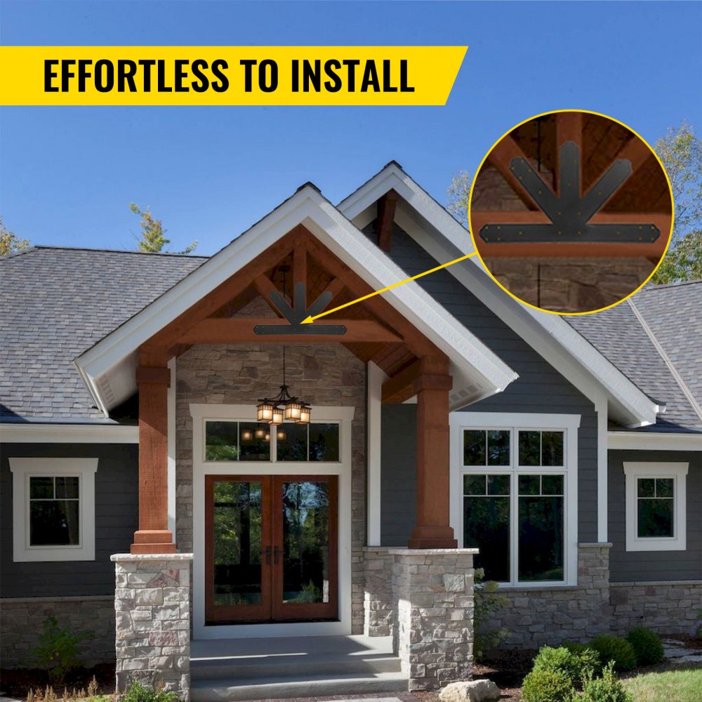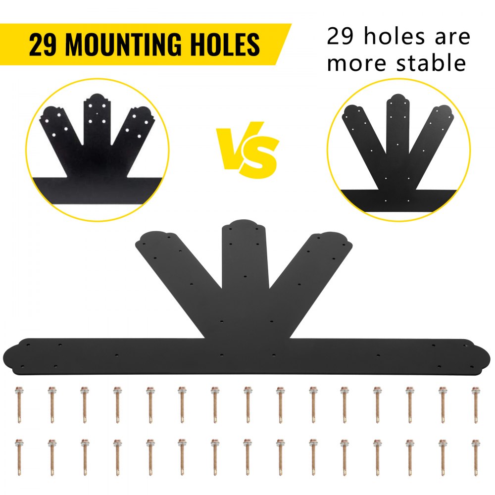 Enhance your outdoor projects with the VEVOR Gable Plate, expertly crafted from 4 mm thick steel and finished with a sleek black powder coating for added durability and visual appeal This sturdy gable bracket simplifies installation, providing a reliable connection for wooden beams with the included screws Featuring a total of 29 carefully placed holes, it ensures maximum safety and stability when mounted.