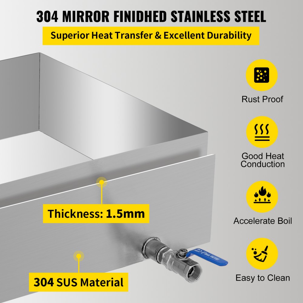 Elevate your cooking experience with this top-notch evaporator pan crafted from 304 food-grade stainless steel, featuring a polished mirror finish Equipped with a 3/4-inch throttle valve, it allows for precise control when processing maple syrup Perfect for enhancing your favorite foods such as pancakes, waffles, oatmeal, and ice cream