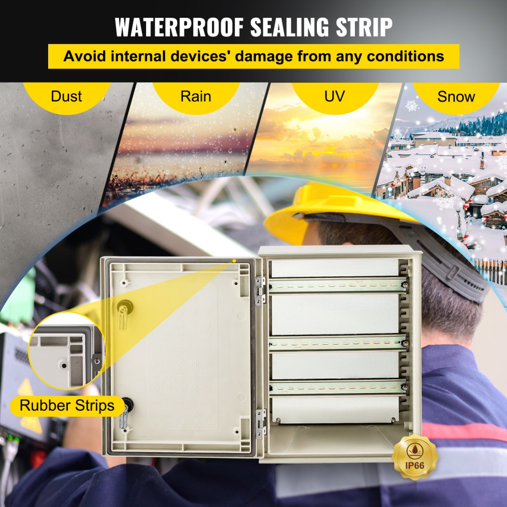 Introducing the VEVOR NEMA Steel Enclosure, expertly crafted for secure installations Made from premium fiberglass reinforced polyester, this enclosure is built to last It features an innovative locking mechanism, sturdy hinges, and effective sealing strips, all contributing to its impressive IP66 rating This protective box is perfect for safeguarding plug-ins, power cords, and various devices in harsh environments.