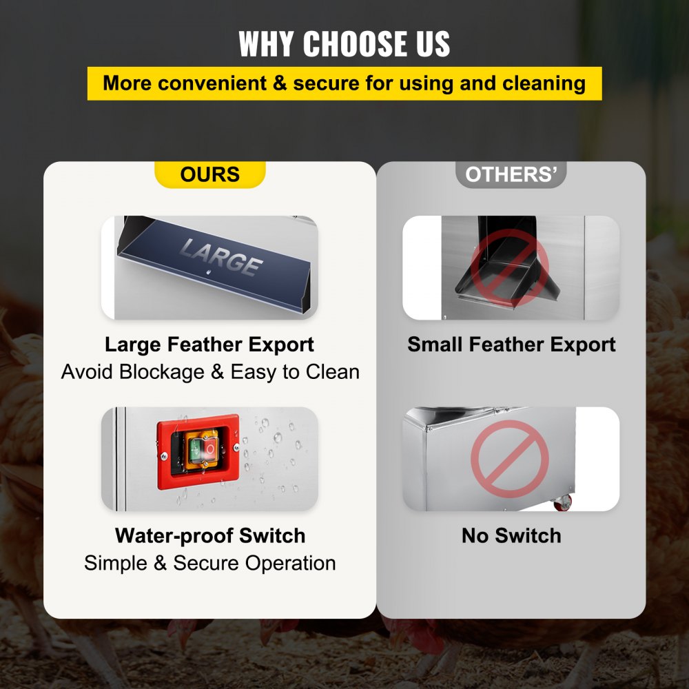 Designed for convenience, the large feather export allows for effortless cleaning Safety is enhanced with a waterproof switch, ensuring secure operation Plus, the chicken plucker is equipped with four wheels and two handles, making it easily mobile for all your de-feathering needs.