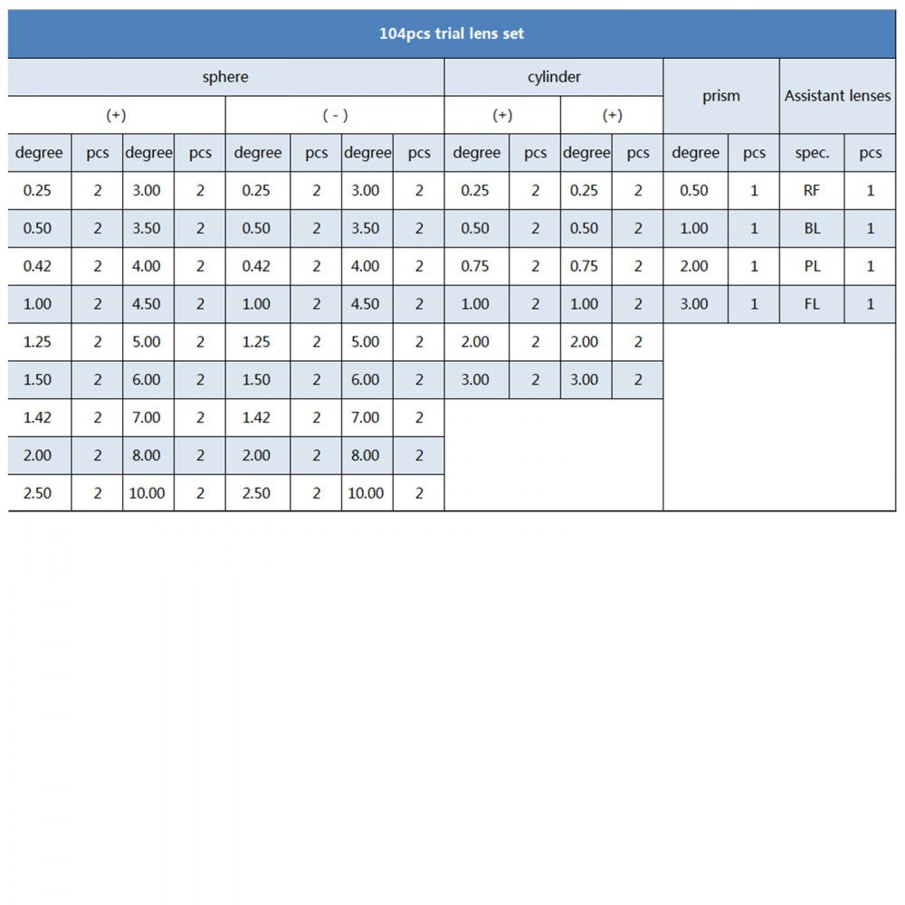 Optimize your eye care practice with the 104-piece Trial Lens Set, expertly crafted for optometric evaluations This comprehensive kit features lenses that provide a wide field of view and a large aperture, making it easier to identify various refractive errors, including myopia, hyperopia, presbyopia, astigmatism, and color blindness The durable aluminum storage box ensures that all components are securely stored and well-preserved, making it a favorite choice among ophthalmologists and opticians in clinical settings.