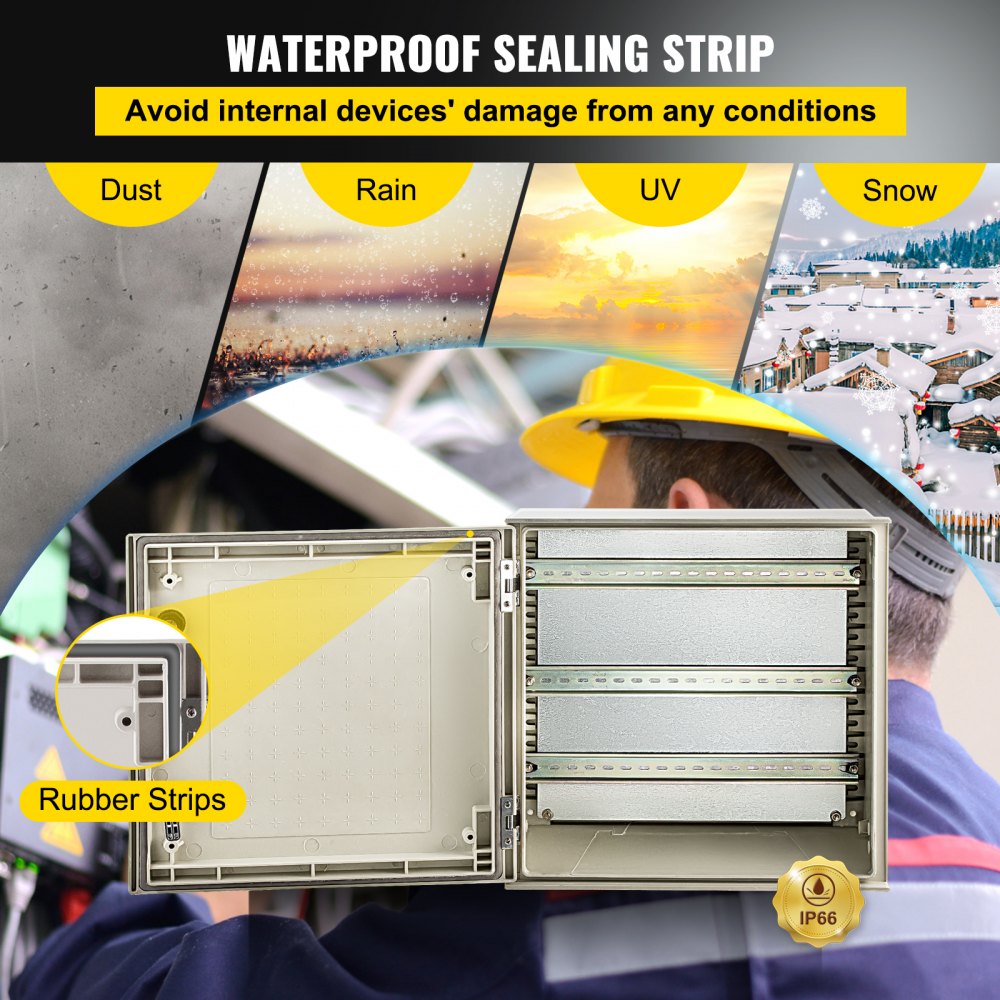 Introducing the VEVOR NEMA Steel Enclosure, constructed from durable fiberglass reinforced polyester for maximum strength This enclosure features a reliable locking mechanism, sturdy hinges, and effective sealing strips to protect your plugs and power cords in challenging environments With an impressive IP66 protection rating, it’s suitable for various indoor and outdoor applications across industries such as construction and electrical work.