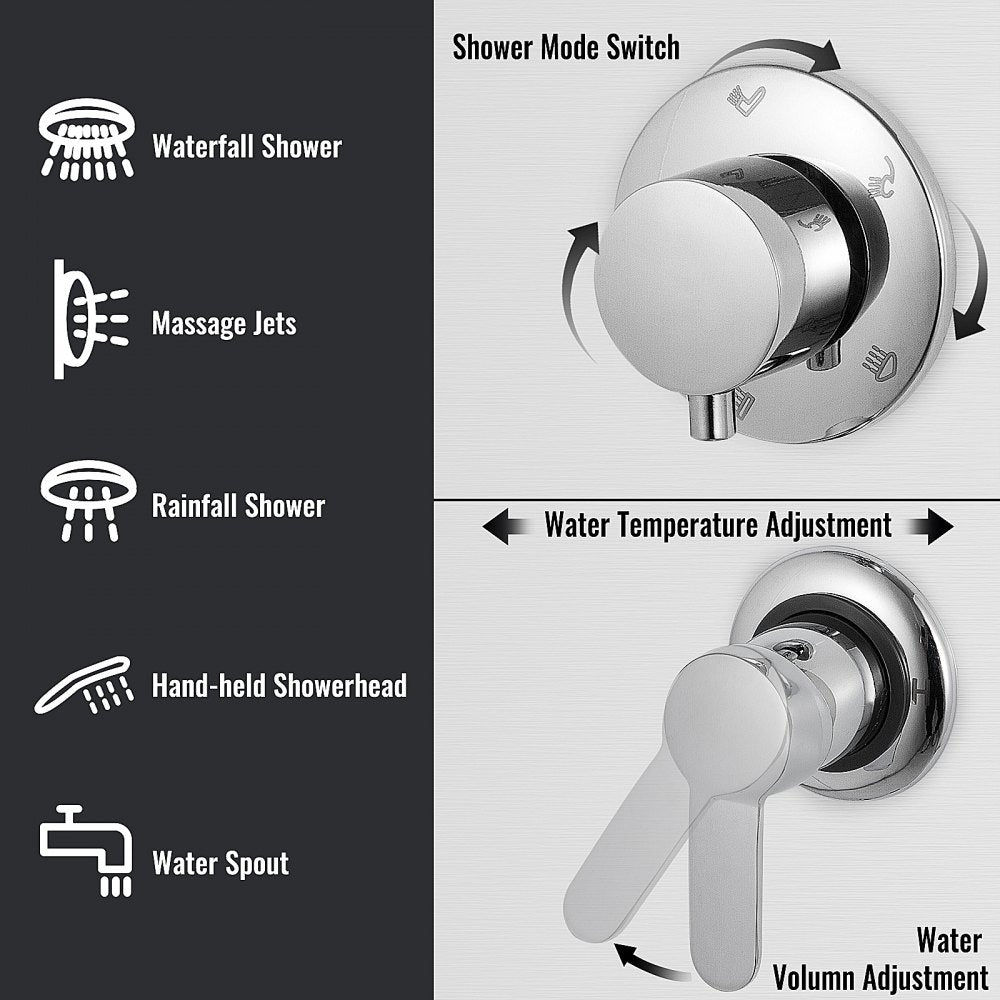 Transform your showering routine with this multifunctional massage panel, perfect for residential or commercial settings Crafted from premium 304 stainless steel, it offers five invigorating shower options: rainfall, waterfall, massage jets, tub spout, and hand shower Experience ultimate relaxation as it helps alleviate stress and rejuvenate your mind and body Its luxurious design seamlessly complements modern bathroom interiors, making the VEVOR shower panel an outstanding addition to any space.