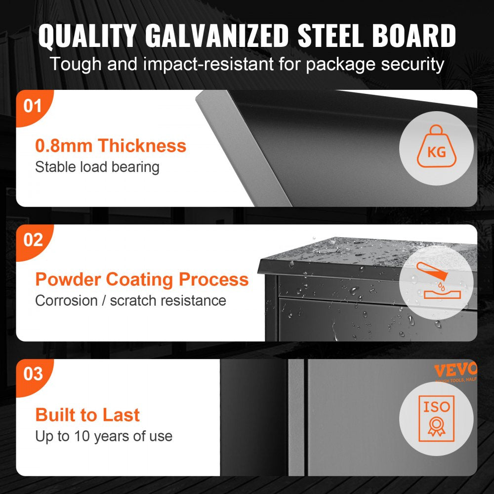 Keep your packages secure with the VEVOR delivery box, expertly designed to protect your parcels from theft Its robust construction features a coded lock system that enhances security and prevents unauthorized access An anti-theft baffle further safeguards your items, making this box a reliable choice for those concerned about package theft Constructed from 08 mm galvanized steel, this delivery box offers durability and is suitable for various weather conditions.