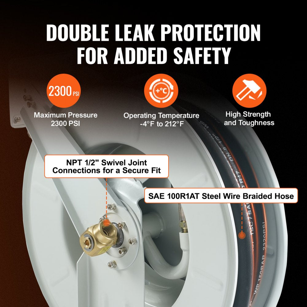 The 1/2-inch-diameter hose is robust enough to endure frequent use and extreme conditions, providing longevity and stability Designed to handle exposure to harsh substances, the high-quality construction keeps every component functioning effectively, ensuring the induction nozzle performs consistently Embrace a dependable and efficient solution with the VEVOR fuel hose reel, designed to meet all your fueling needs seamlessly.
