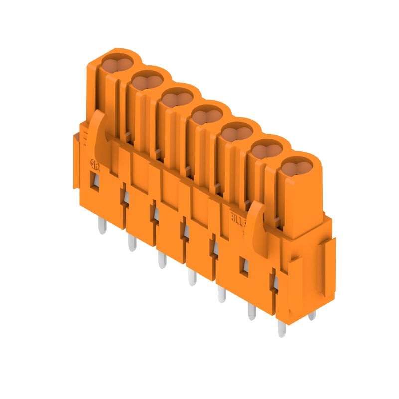 Introducing a reliable PCB plug-in connector featuring a female header, specifically designed for through-hole soldering with a 508 mm pitch This connector boasts 7 poles and is structured at a 180° angle for enhanced versatility The solder pins measure 32 mm in length and come with a tinned finish in a vibrant orange color Ideal for standard packaging applications, this connector ensures robust electrical connections for your projects.