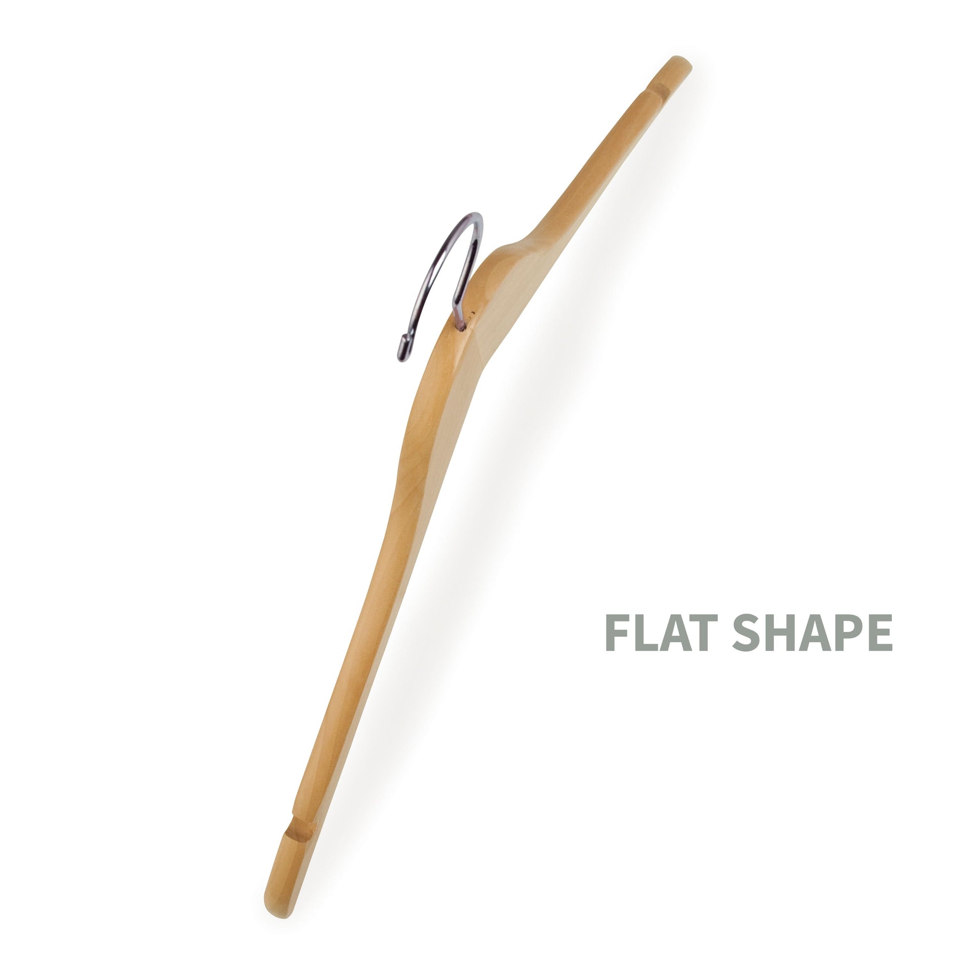 • Our high-quality, deluxe wooden hangers are available at incredibly low prices. This 17" suit hanger in a natural wood finish with a chrome hook has a wooden bar with a spring clamp to hold slacks secure. Hangers contain notches to accommodate garments with straps. Flat hangers allow the most amount of garments to fit on a display.