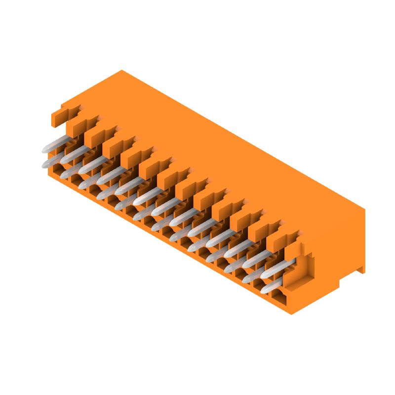 Introducing a versatile male header PCB plug-in connector, designed with a closed side structure and THT solder connections This component features a 350 mm pitch and offers 26 poles arranged at a 180° angle, complete with 35 mm solder pin lengths It comes conveniently packaged in an eye-catching orange box, ensuring both protection and easy storage.