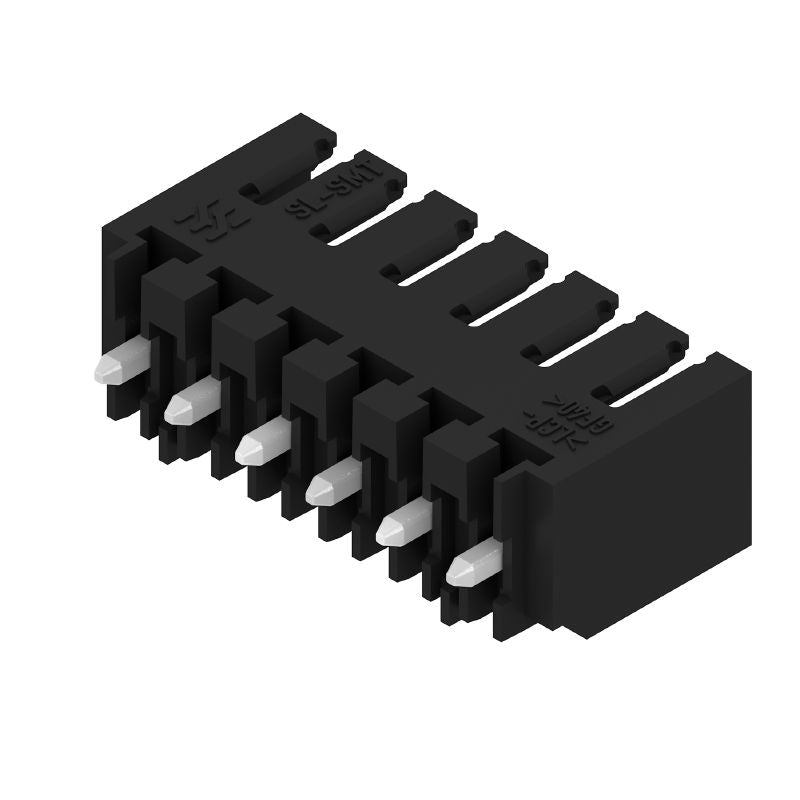 Introducing the SL-SMT 350/06/180G 15SN BK RL male header PCB plug-in connector, crafted for reliable performance with a closed side suitable for through-hole or THT solder connections This connector features a pitch of 35 mm and is equipped with 6 poles, arranged in a 180-degree angled design Each tinned solder pin measures 15 mm in length, ensuring solid connectivity Compliant with RoHS standards, this product comes with a variety of safety approvals, making it a trusted choice for your electronic projects.