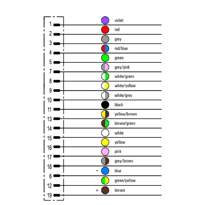 | Colour coding | violet, red, black, green/yellow, yellow/brown, brown/green, white, yellow, pink, grey/brown, brown, grey, red/blue, green, blue, grey/pink, white/green, white/yellow, white/grey |