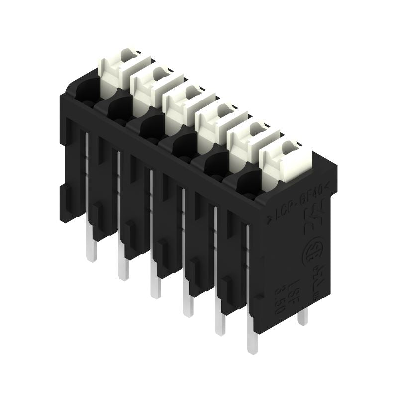 Introducing the LSF-SMT 350/06/180, a high-performance printed circuit board terminal tailored for 350 mm connections This terminal features six poles and a unique 180° solder pin arrangement, with each solder pin measuring 35 mm in length Its elegant black color enhances its modern design, while the PUSH IN connection method, complemented by an actuator, offers ease of use With a maximum clamping range of 1.