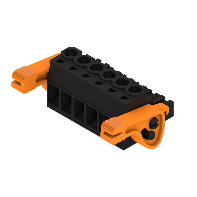 Introducing a premium female plug-in connector specifically crafted for PCB applications, featuring a pitch of 508 mm This connector is equipped with six poles configured at a 180-degree angle, and its clamping yoke connection allows for wire cross-sections of up to 4 mm² It meets RoHS and IEC regulations, with certification under UL file number E60693, confirming compliance from both UR and cURus Each connector comes securely packaged in boxes, making it ideal for field connections.