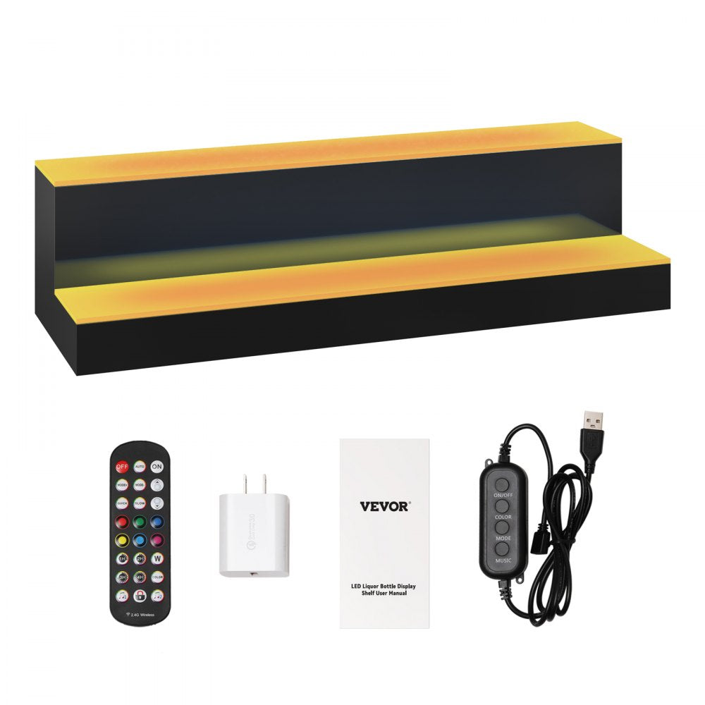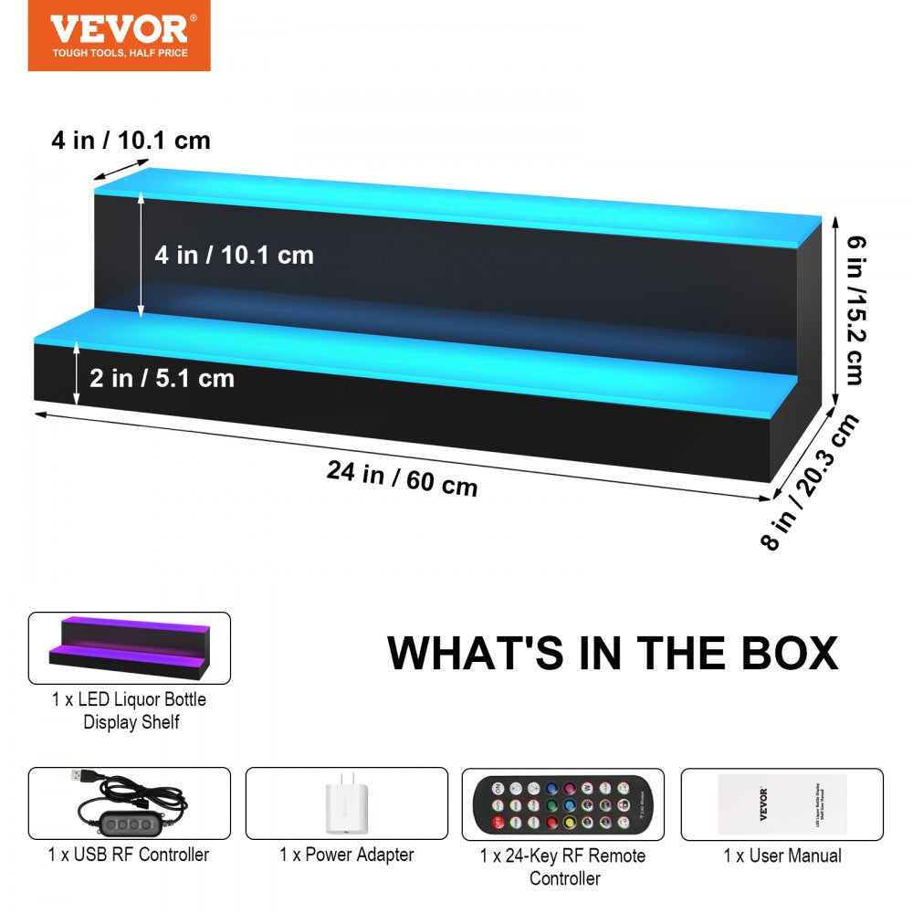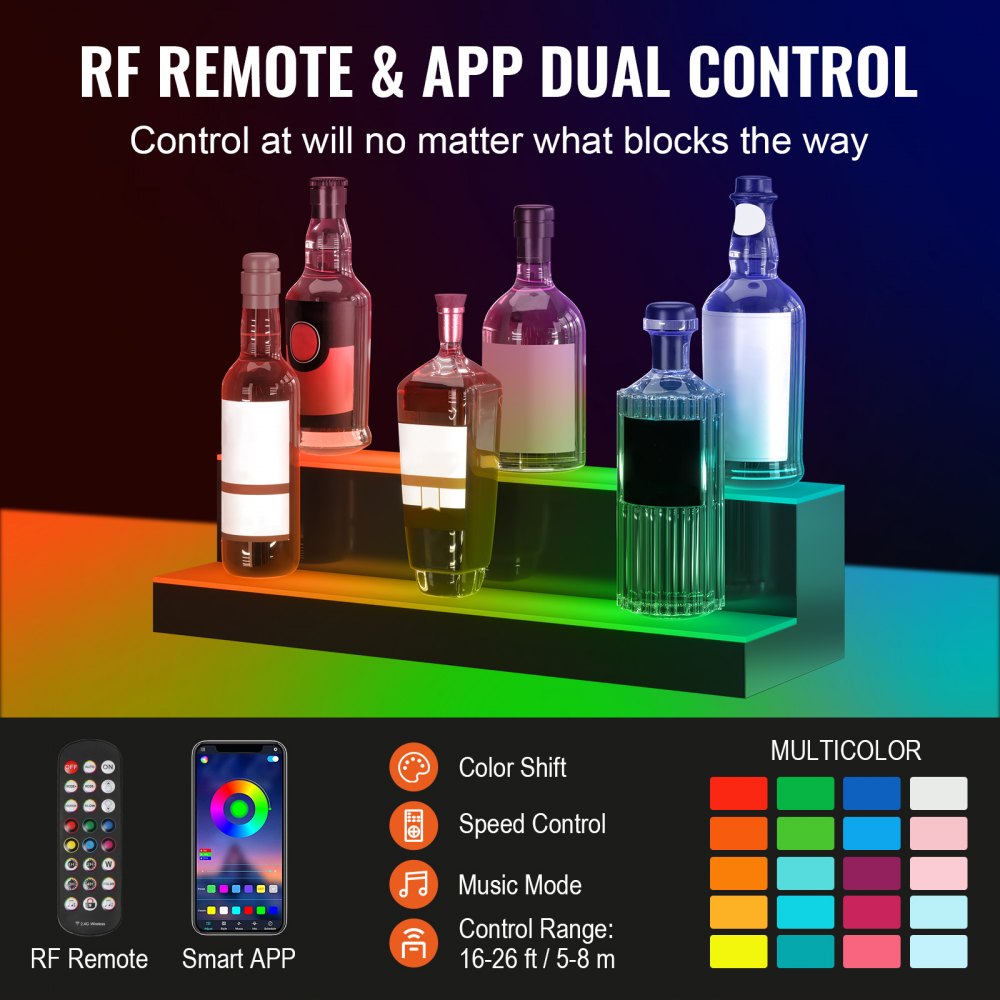 Elevate your home bar with this 24-inch, two-tier LED liquor bottle shelf, expertly crafted from high-quality acrylic Featuring dual control options through RF remote or app, this innovative shelf allows you to create a stunning display for your beverages Transform your bar setup with this eye-catching illuminated bottle showcase!.