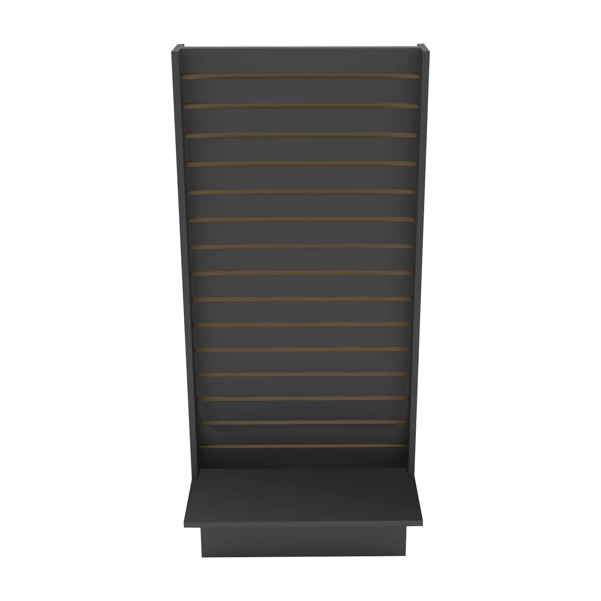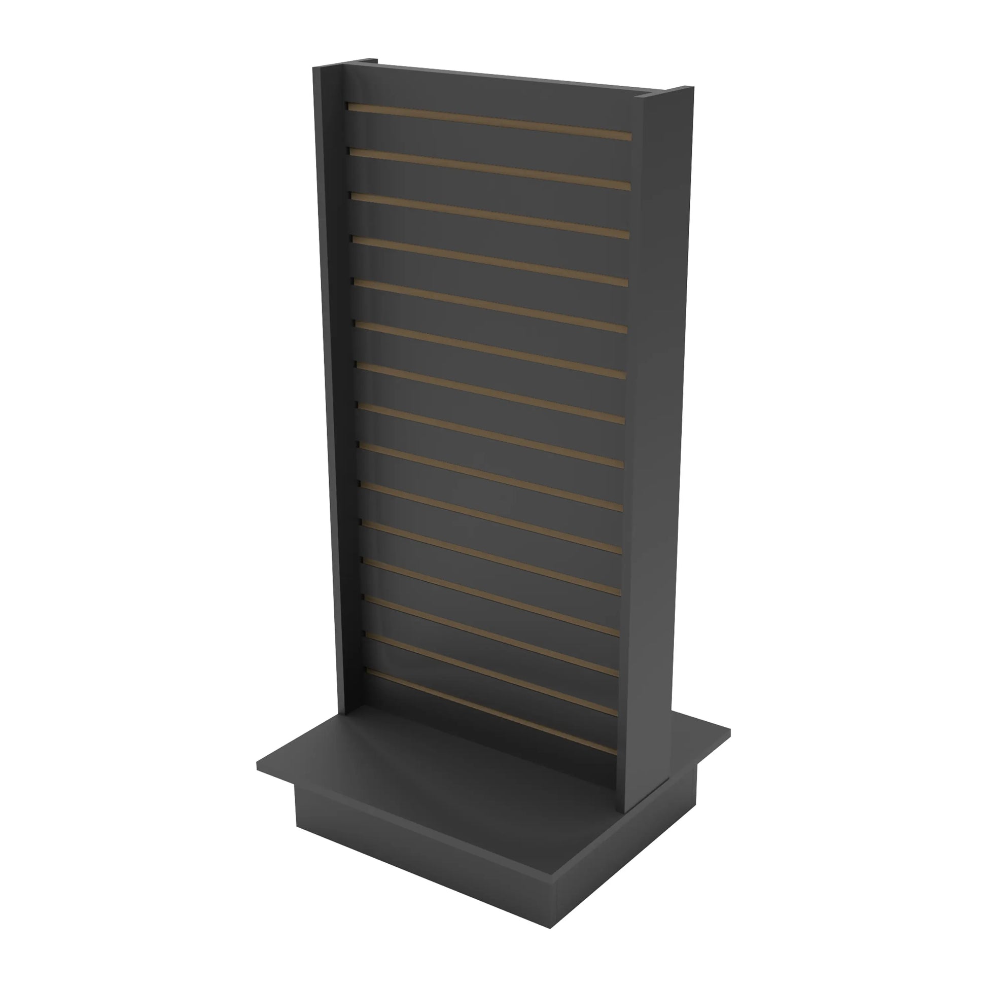 • Econoco's black 2-way slatwall merchandiser is a great choice to display apparel or general merchandise. This slatwall unit provides 16 square feet of display area while only using roughly 2 square feet of floor space. Measures 25-1/2"W x 24"L x 54" H.
