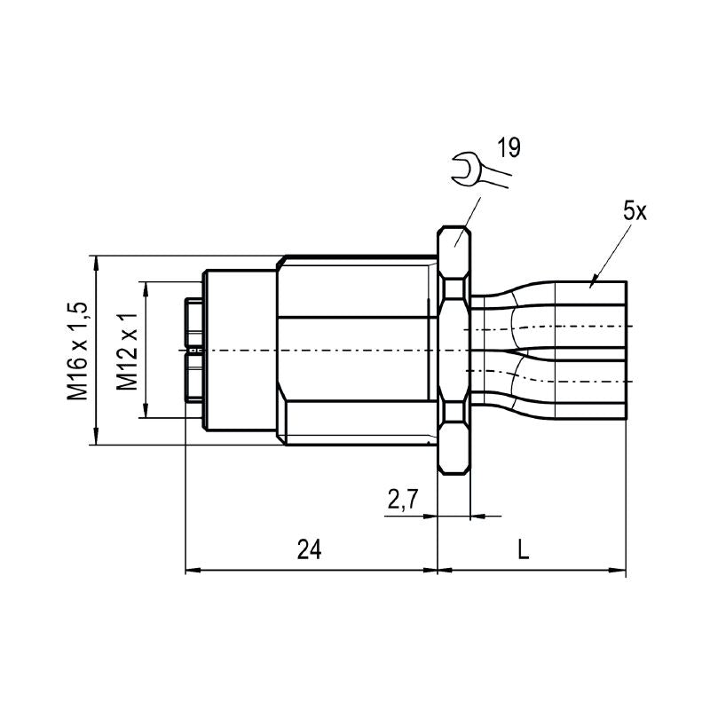 Discover the versatility of this product, which features integrated M12 plugs with a straight female socket design It includes a robust M 16 x 15 mounting thread and offers a 5-pole configuration, making it ideal for various applications With a cable strand length of 02 meters, it is perfectly suited for rear panel mounting, ensuring ease of installation and functionality.