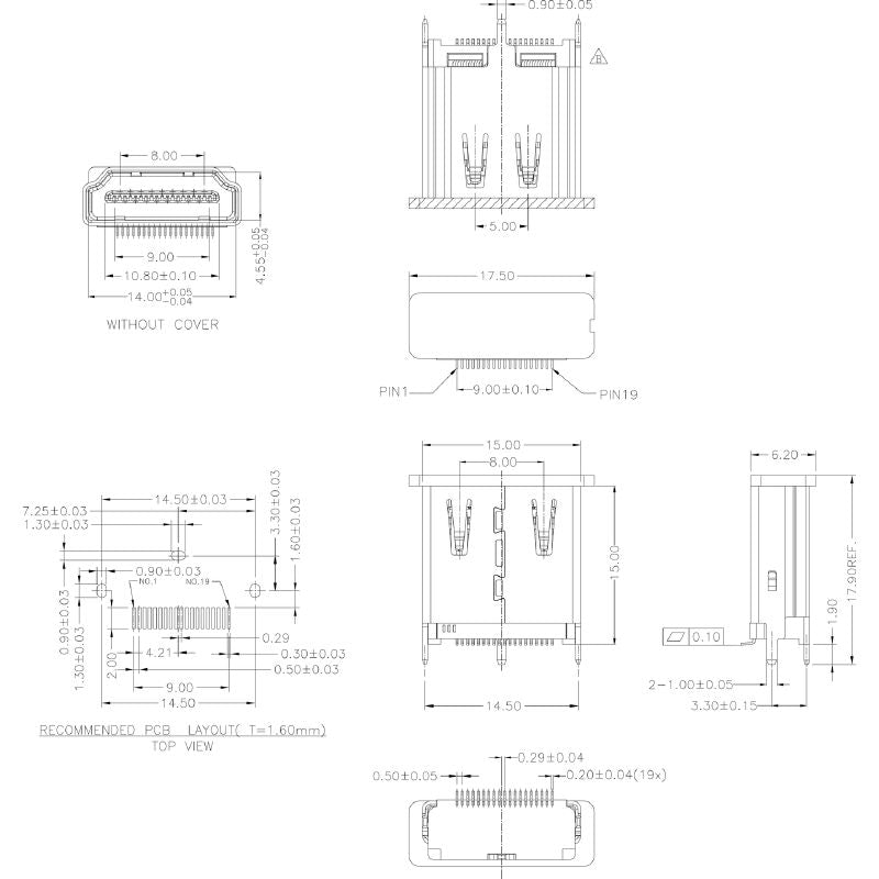 - 3107650000 - 90° Female HDMI Connector, 19 Poles, Gold Finish (Pack of 3000)