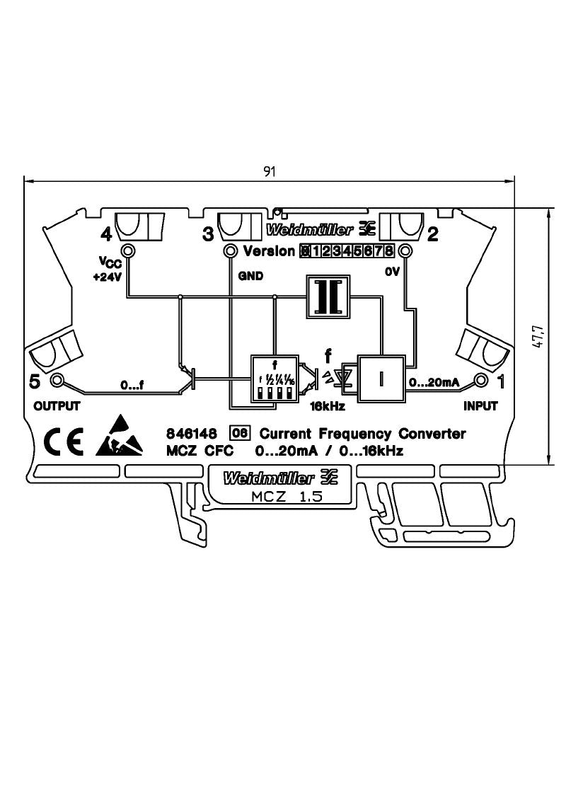 Introducing the MCZ CFC 0-20MA, a versatile DC/f transformer that converts an input signal ranging from 0-20 mA into output frequencies of 0, 1, 4, 8, or 16 kHz Measuring 91 mm in length, 6 mm in width, and 632 mm in depth, this compact device is engineered for effective signal processing It operates safely within temperature limits and complies with key standards such as RoHS and REACH, ensuring a reliable performance suitable for various applications.