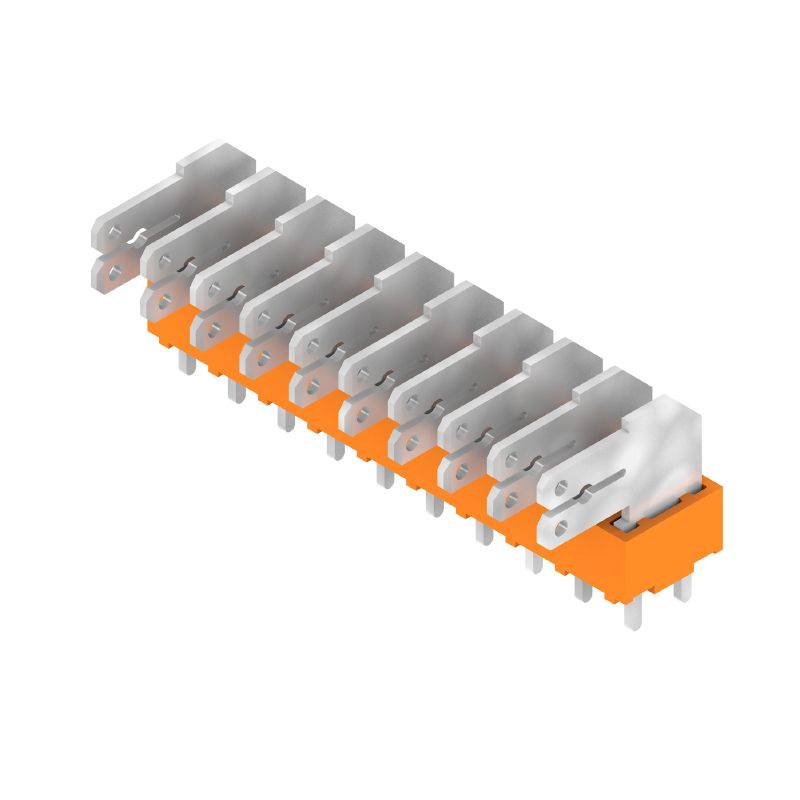 Discover this set of printed circuit board terminals featuring a compact 500 mm pitch Each terminal can support up to 10 poles with a convenient 90° orientation The solder pins, measuring 35 mm in length, sport a vibrant orange tinned finish for enhanced conductivity These terminals employ a flat-blade connection method and are conveniently packaged in a sturdy box for easy storage and transport.