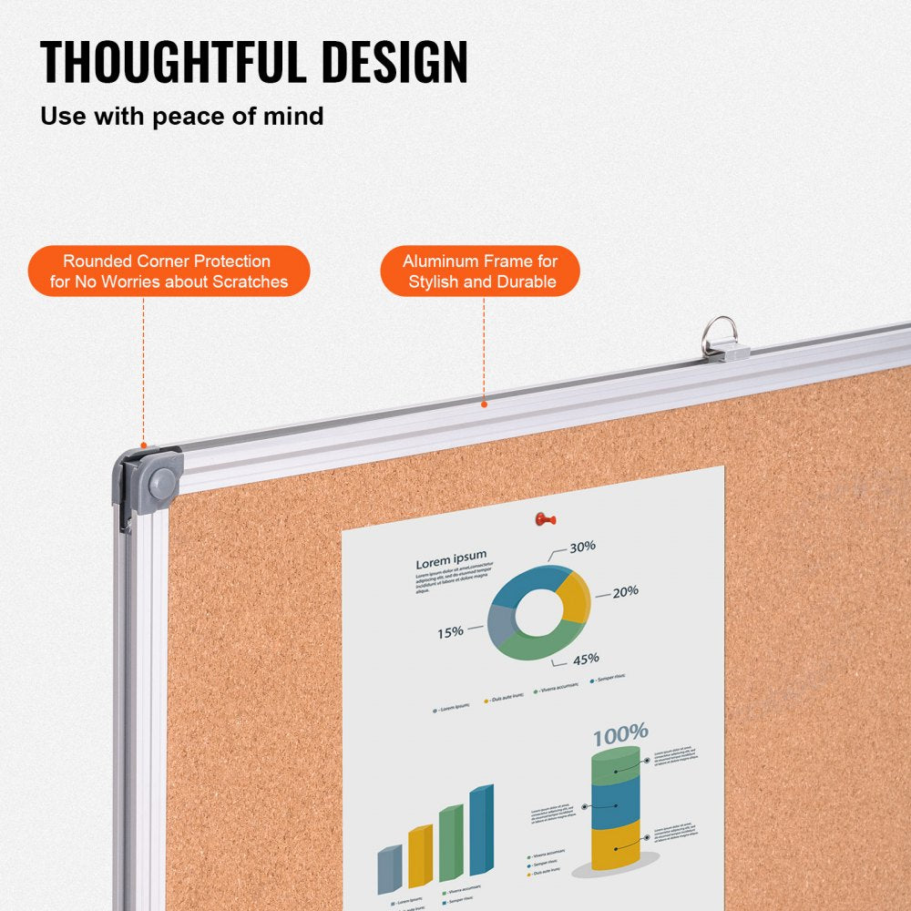 Elevate your organization with the VEVOR bulletin board, measuring a generous 48 inches by 36 inches This ample space allows you to effortlessly pin photos, reminders, and various materials, making it a great addition to any home or office setting The cork surface is enhanced with seven layers of corrugated paper, effectively minimizing unsightly pinholes for long-lasting use Its design includes glued and pressed layers to prevent bulging and to enhance durability, ensuring the board is puncture-resistant.