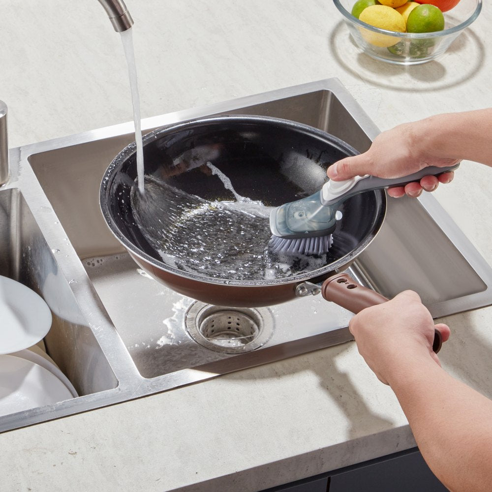 Made from robust materials for long-lasting use, it includes three interchangeable brush heads for varied cleaning needs Plus, with its user-friendly cap for simple refills and a hanging hole for easy storage, this dish brush is a must-have for any kitchen.