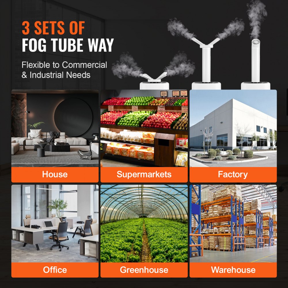 Introducing the VEVOR Commercial Humidifier, expertly crafted for industrial applications This robust unit boasts a generous water capacity of 21 liters (55 gallons), effectively adding moisture to areas between 4736 and 12917 square feet Operating at a whisper-quiet level of 35 dB or less, it provides a peaceful environment while maintaining optimal humidity levels from 40%RH to 90%RH