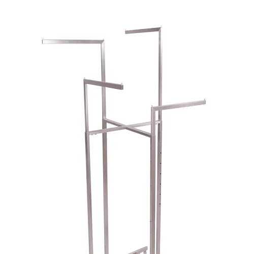 When shopping for additional selling floor display units, retailers know that Econoco offers hundreds of merchandisers. This selection includes our popular 4-way rack with straight arms in a satin nickel finish. The arms adjust in height from 49.65" to 70.65" to allow for the longest evening or bridal gowns. The tubular base is 33" wide and allows generous display space within a small selling floor footprint. The unit's arms are 17" long and are made of 1" x½" rectangular steel tubing. The units arms can be varied in height to showcase several different types of apparel such as dresses, blouses, and or skirts and pants from the same designer's line.