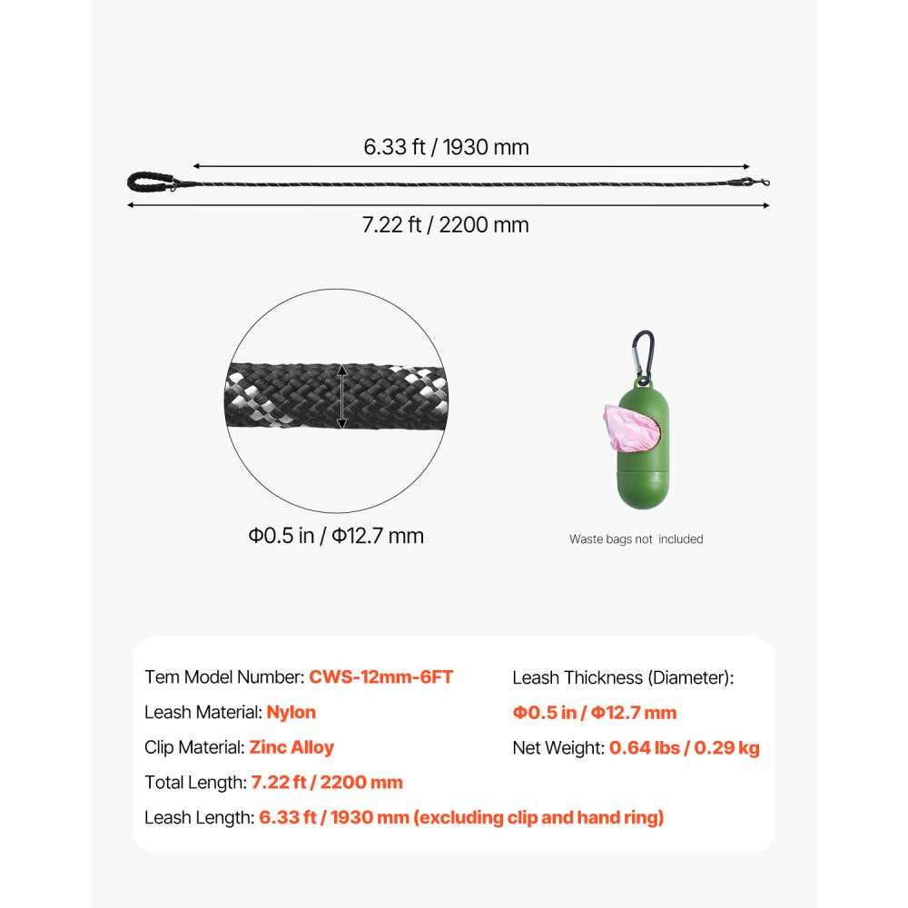 - CWS-12mm-6FT - Durable 6ft Nylon Dog Leash with Comfortable Handle & Waste Bag Holder