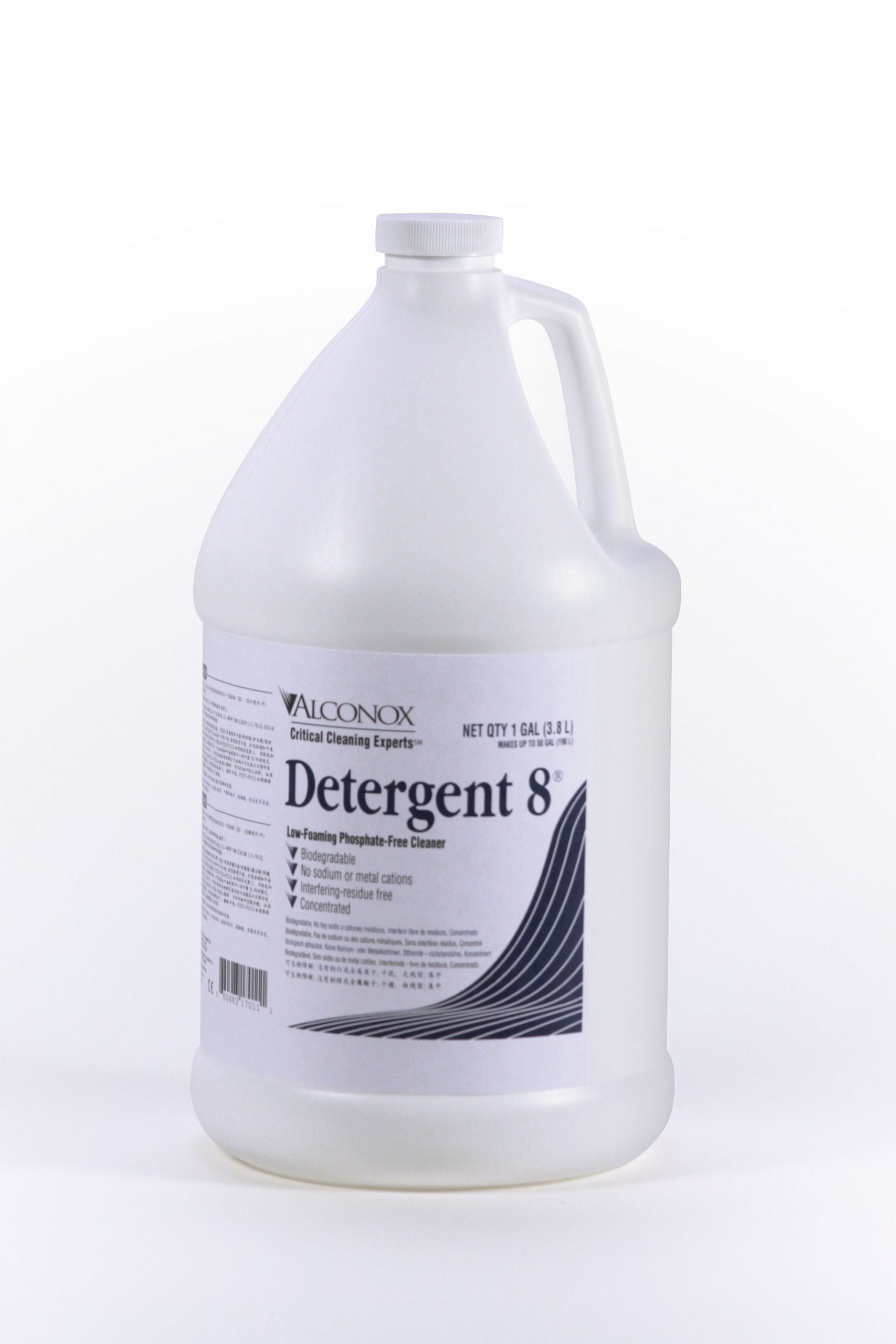 Detergent 8 is a nonionic, detergent for labware washers, PC board washers, power-spray systems, ultrasonic and manual cleaning. Removes oils, resins rosins, and fluxes from PC circuit boards, electronic parts, phosphate sensitive labware and nuclear contaminated equipment with no interfering conductive residues. Excellent replacement for solvent cleaning. Dilute 3:100. pH 11.