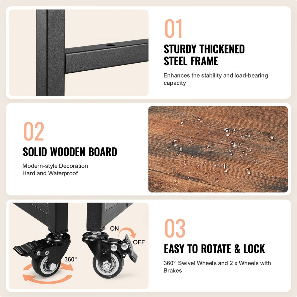 The table is built for mobility and stability with four sturdy industrial casters—two of which include locks for secure positioning