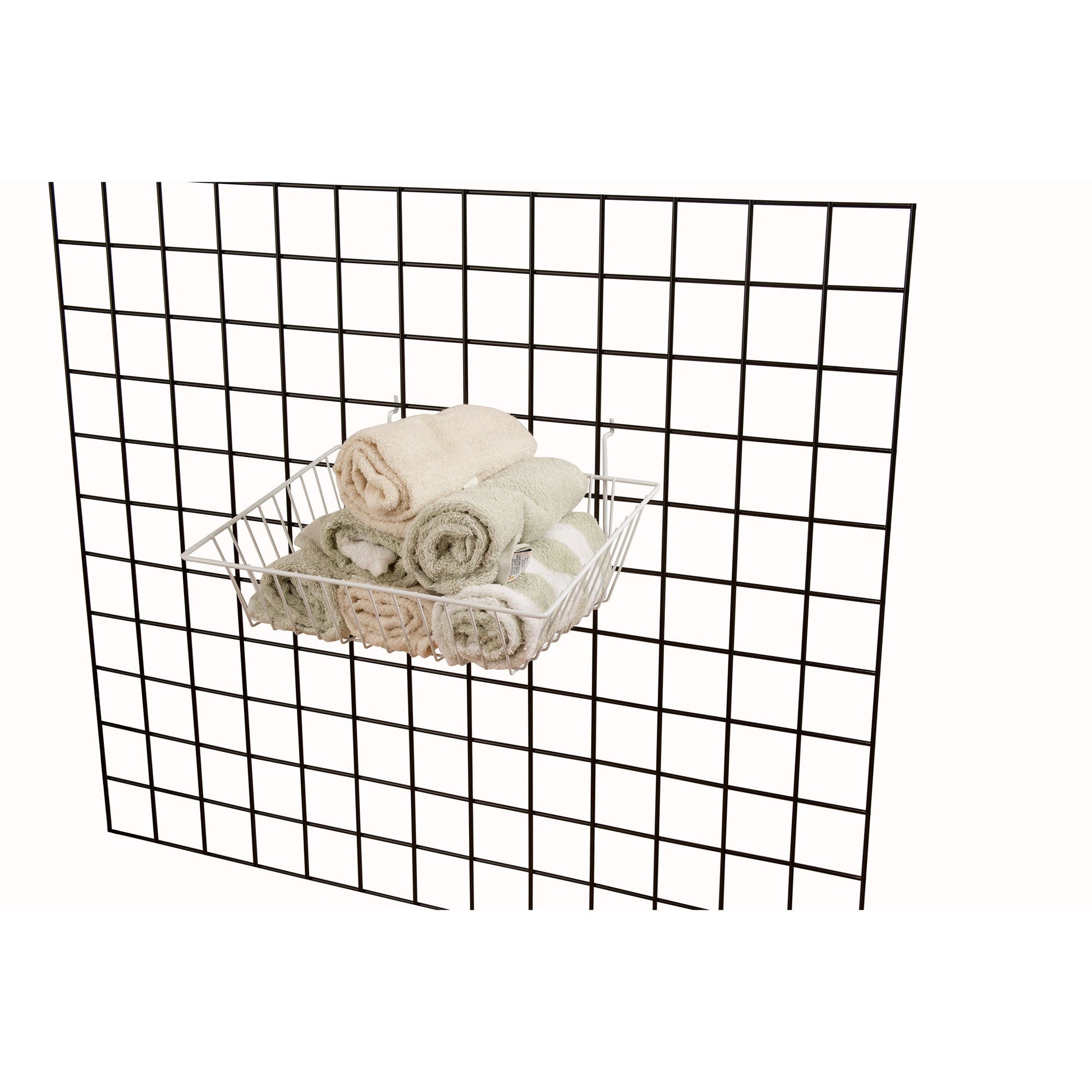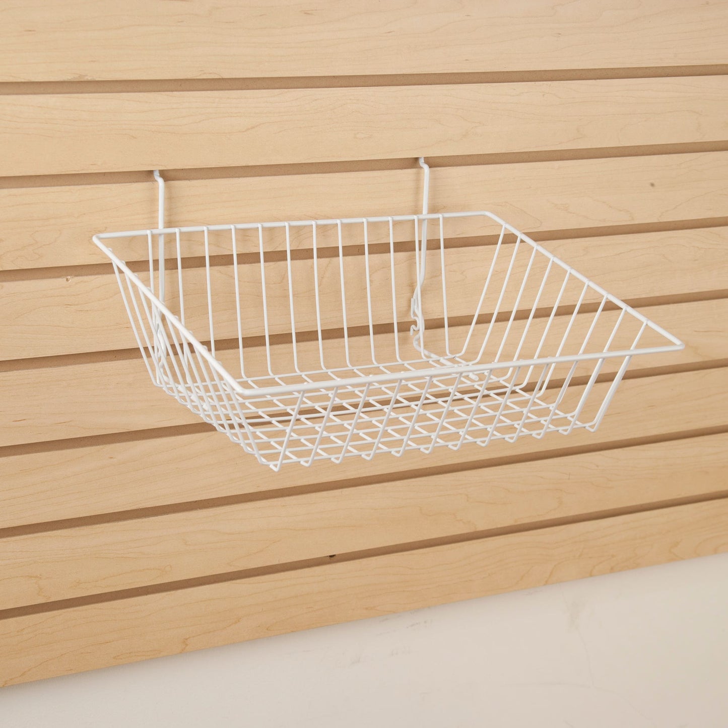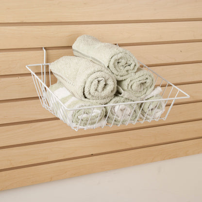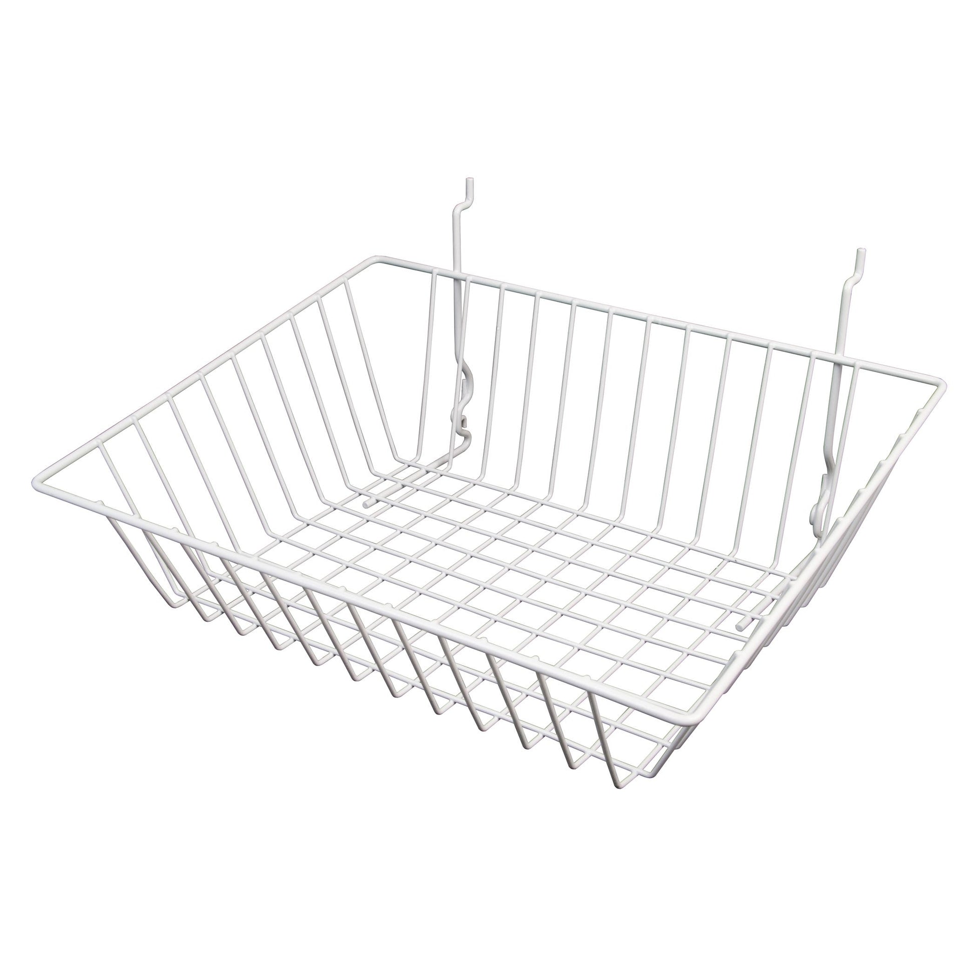 • Retailers can seldom afford to expand their premises. One way to maximize selling floor opportunities is with Econoco's All Purpose Sloping Baskets. These wire coated, open baskets provide a great option for merchandising difficult to display inventory. Econoco's All Purpose Sloping Baskets measure 15"W x 12"D x 5"D x 3"F. In addition they offer a sloping front that makes self-service easy and speeds item replenishment by staff. Coated with a selection of durable epoxy finishes, our white baskets is great for drug store chains, big box retailers, children's boutiques, toy stores, and bridal salons. These baskets provide the perfect opportunity to display socks, gloves, hair ribbons and clips, toys, and small packaged goods. It is never a mystery as to what it being offered for sale: basket contents are clearly visible to shoppers. Econoco's universal coated wire baskets will work with all types of wall-hung panels: Gridwall, Slatwall, and pegboard.