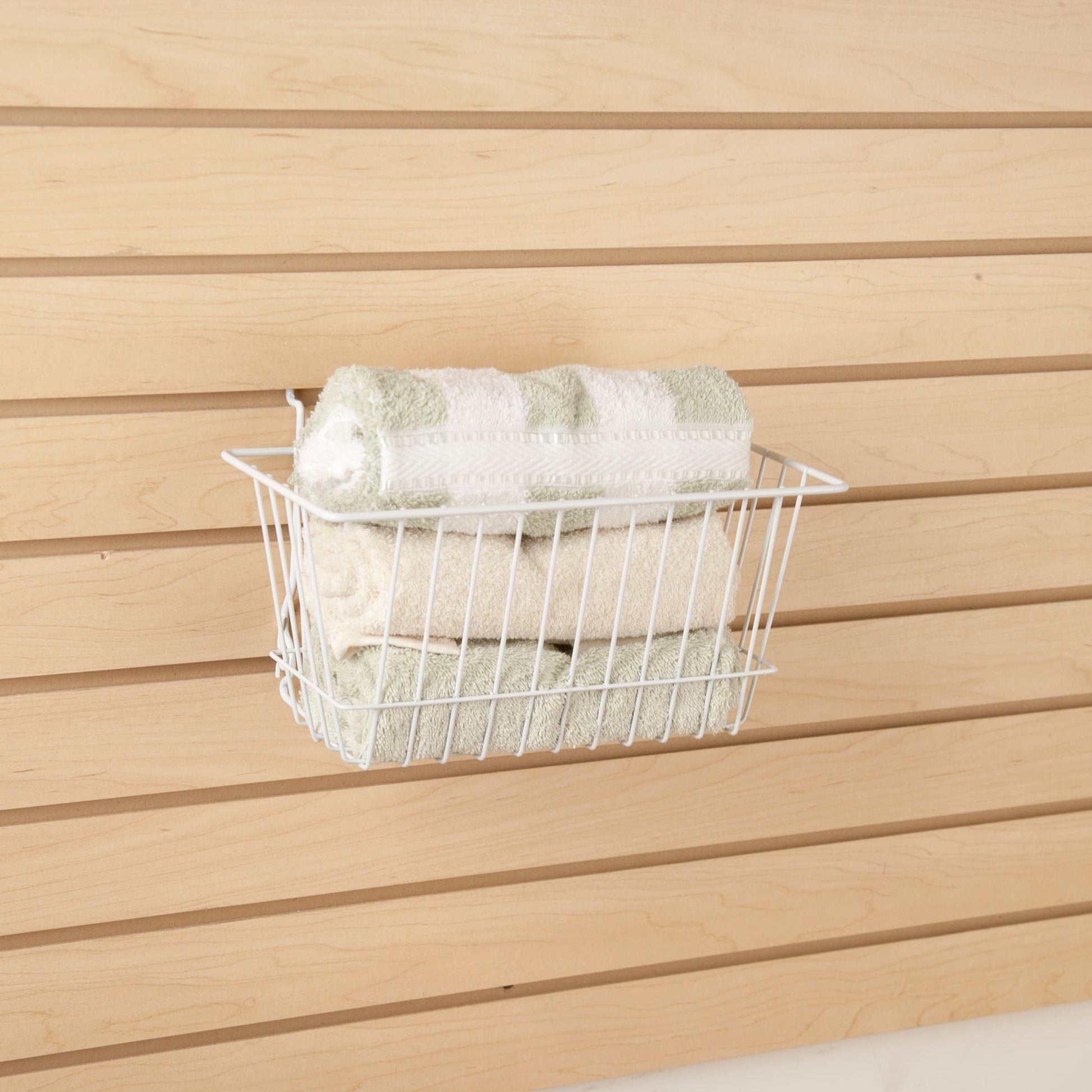 • Every retailer faces the dilemma of trying to fit as much merchandise onto their selling floor without crowding or narrowing their aisles. Econoco's solution to economize on space without sacrificing inventory is our All Purpose Narrow Basket. It measures 12"W x 6"D x 6"H so it does not extend too far into walkways nor does it limit the amount of merchandise that it can accommodate. Coated with a selection of durable epoxy finishes our semi-gloss white basket is seen in big box stores, bridal boutiques, cosmetics aisles, and in select department stores. Try these baskets to display items that are easily lost, damaged or shoplifted. Ideal for displaying small loose goods, just use your imagination and you'll be able to clear your cluttered POS counters. Packaged goods such as hosiery, gloves, glasses, and underwear and socks lend themselves well to being merchandised in our narrow baskets which prevent items from falling out onto your selling floor. Also items displayed in our baskets can be identified from a distance and will attract shoppers. Another bonus is that the wire baskets are universal-meaning you'll never be fishing around in your back room for the right display component. They'll work with every wall-hung panel system made including Gridwall, Slatwall and pegboard.