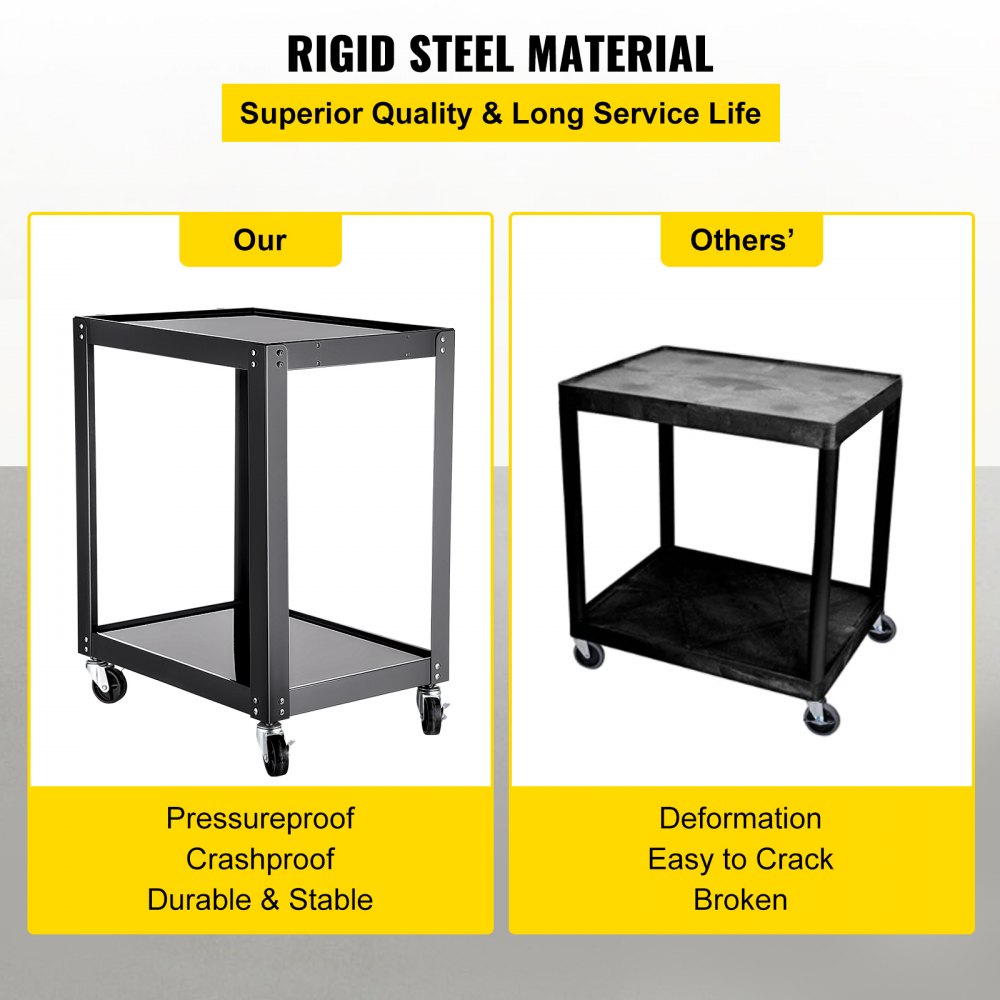 Experience versatility with the VEVOR AV Cart, expertly crafted for ease of movement and practicality This height-adjustable media rolling cart is constructed from robust steel, allowing it to bear up to 150 lbs It boasts two spacious shelves, providing ample room for your essentials Additionally, the integrated power strip offers a hassle-free charging solution, making this cart perfect for various environments such as kitchens, offices, and classrooms.