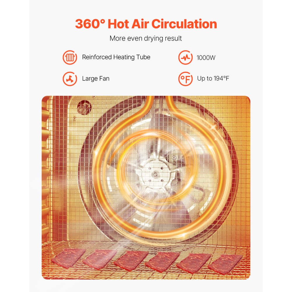 •Efficient & Even Drying: With an upgraded thickened heating tube and large fan, the heating tube generates heat while the fan circulates the warm air inside, evenly penetrating the food..