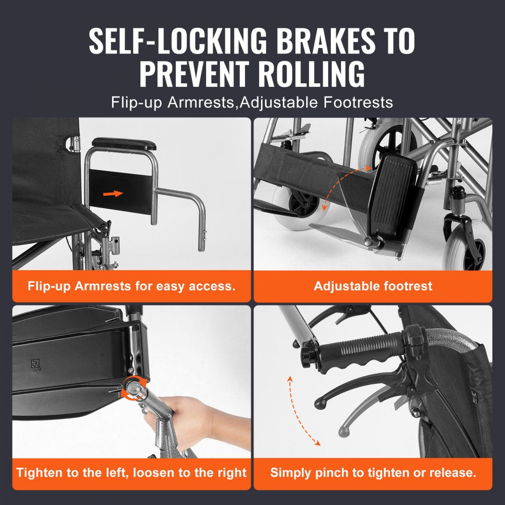 Experience exceptional mobility with the VEVOR Wheelchair, a durable transport chair crafted from sturdy steel This folding chair features a generous 24-inch wide seat and comfortably supports individuals weighing up to 300lbs, making it ideal for various travel environments It emphasizes user comfort and convenience with its self-locking brakes for added security, along with adjustable arm and footrests that facilitate easy boarding and exiting.