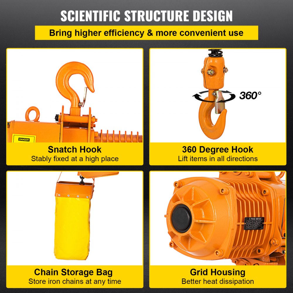 Introducing the powerful VEVOR 2200LB double electric chain hoist, specifically engineered for heavy-duty lifting and transportation tasks This electric hoist prioritizes safety with its integrated pressure transformer and features a high-efficiency electromagnetic contactor for consistent use A dependable double braking system guarantees secure operation Crafted from durable aluminum alloy, the housing is designed to resist rust and corrosion, ensuring durability over time.
