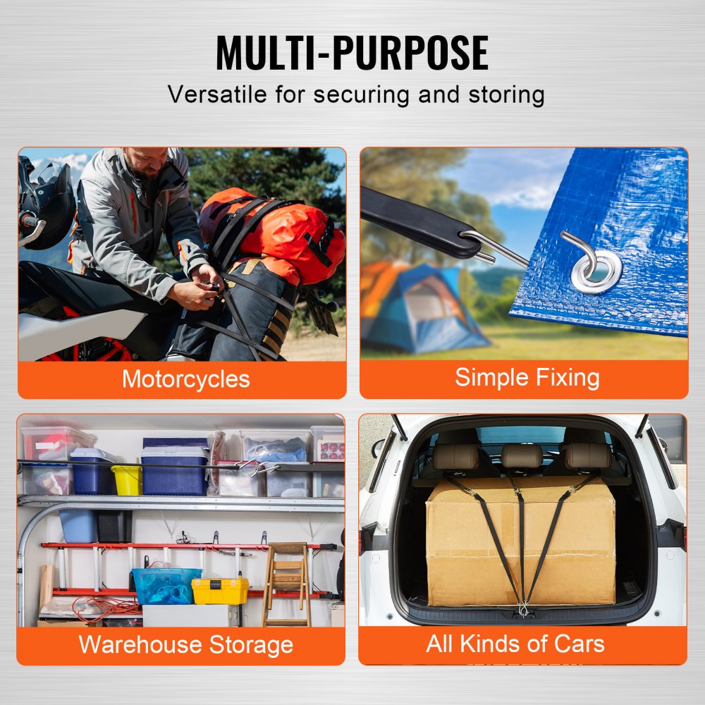 Elevate your storage and transport solutions with VEVOR Bungee Straps These ultra-long stretch bungee cords are expertly crafted to accommodate items of different shapes and sizes, making them indispensable for both storage and secure transportation Built to withstand harsh weather conditions, these heavy-duty bungee cords promise durability and stability over time Ideal for both indoor and outdoor applications, they adapt to your needs, whether you're organizing gear or securing items for travel.