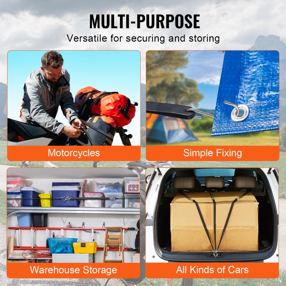 Discover the perfect solution for transporting and securing your belongings with the VEVOR Bungee Straps These remarkably long and stretchy bungee cords are designed to accommodate a variety of items, making them an essential tool for both storage and transport Built to endure harsh weather conditions, these heavy-duty straps guarantee durability and long-lasting stability
