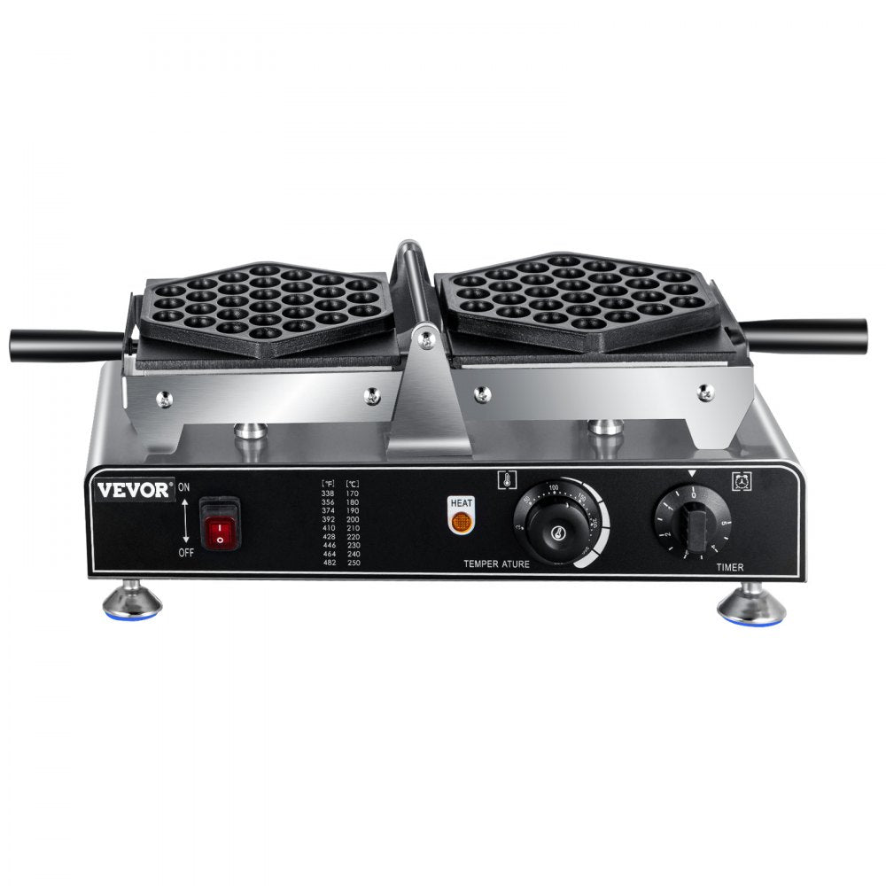 Experience the convenience of our 1500W bubble waffle machine, expertly designed for both home kitchens and commercial settings This machine features dual reversible plates that ensure quick heating and even baking, producing a delightful hexagonal egg waffle in just 5 minutes You can finely tune your baking with adjustable temperature and timer knobs located on the base for precise control Crafted from robust stainless steel, with aluminum plates coated in nonstick Teflon, this waffle maker is not only built for longevity but also easy to maintain.