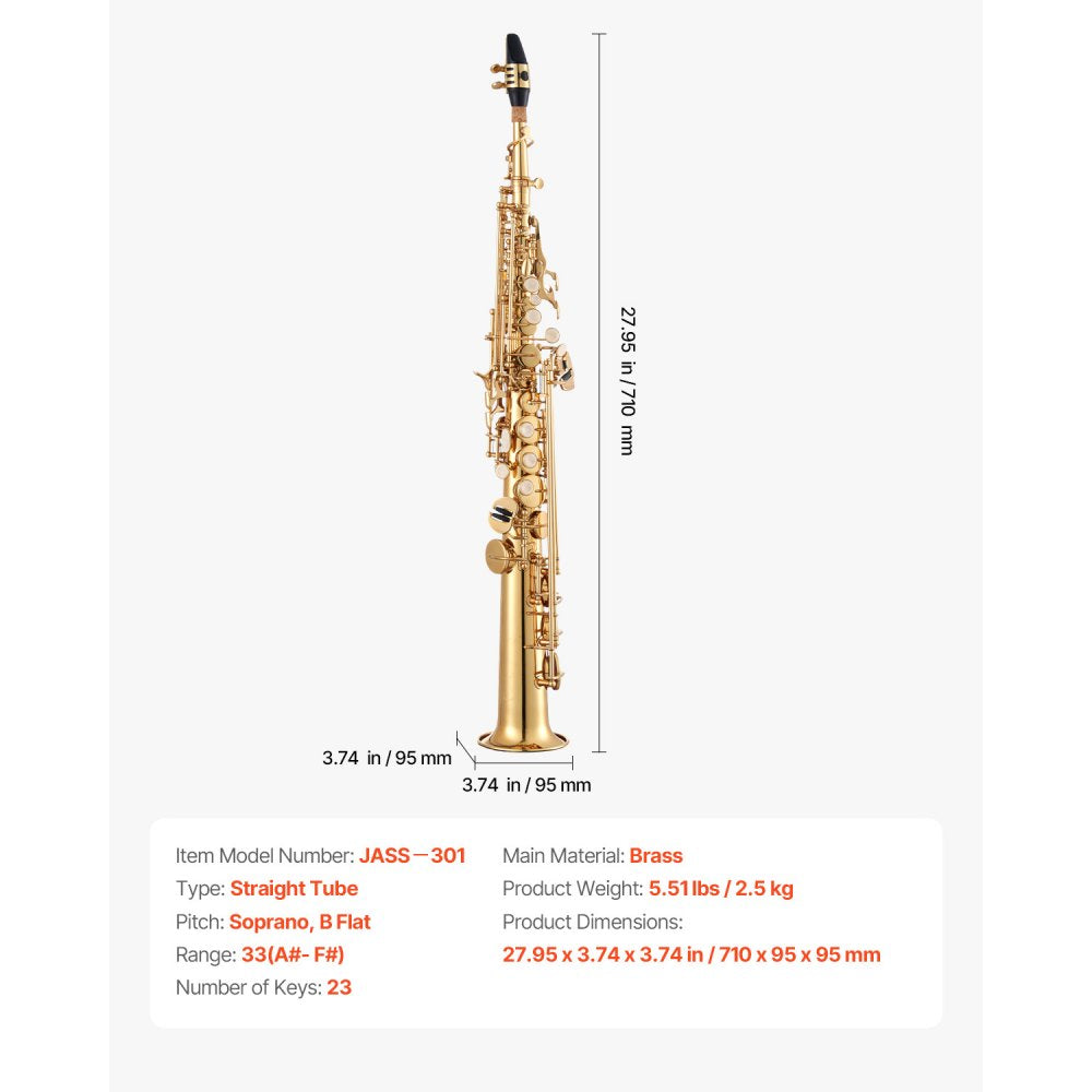 Introducing the B Flat Soprano Saxophone, perfect for novice musicians wanting to explore their musical potential This instrument boasts an impressive 33-note range from A# to F# and is outfitted with 23 keys that deliver a vibrant sound ideal for both solos and improvisational pieces Crafted from brass and finished with an electrophoretic coating, it offers excellent sound clarity and durability