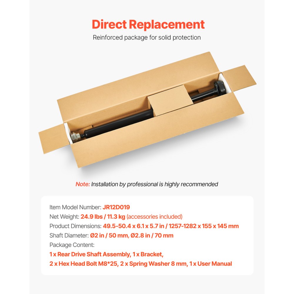 Featuring a universal joint, this drive shaft facilitates smooth power transmission even when there's an angular displacement between the axles, promoting an efficient driving experience and enhanced vehicle reliability Pre-lubricated slip yokes and U-joints with high-temperature grease reduce wear at the connections For installation, professional assistance is recommended; avoid using a steel hammer, and opt for a rubber mallet to prevent damage.
