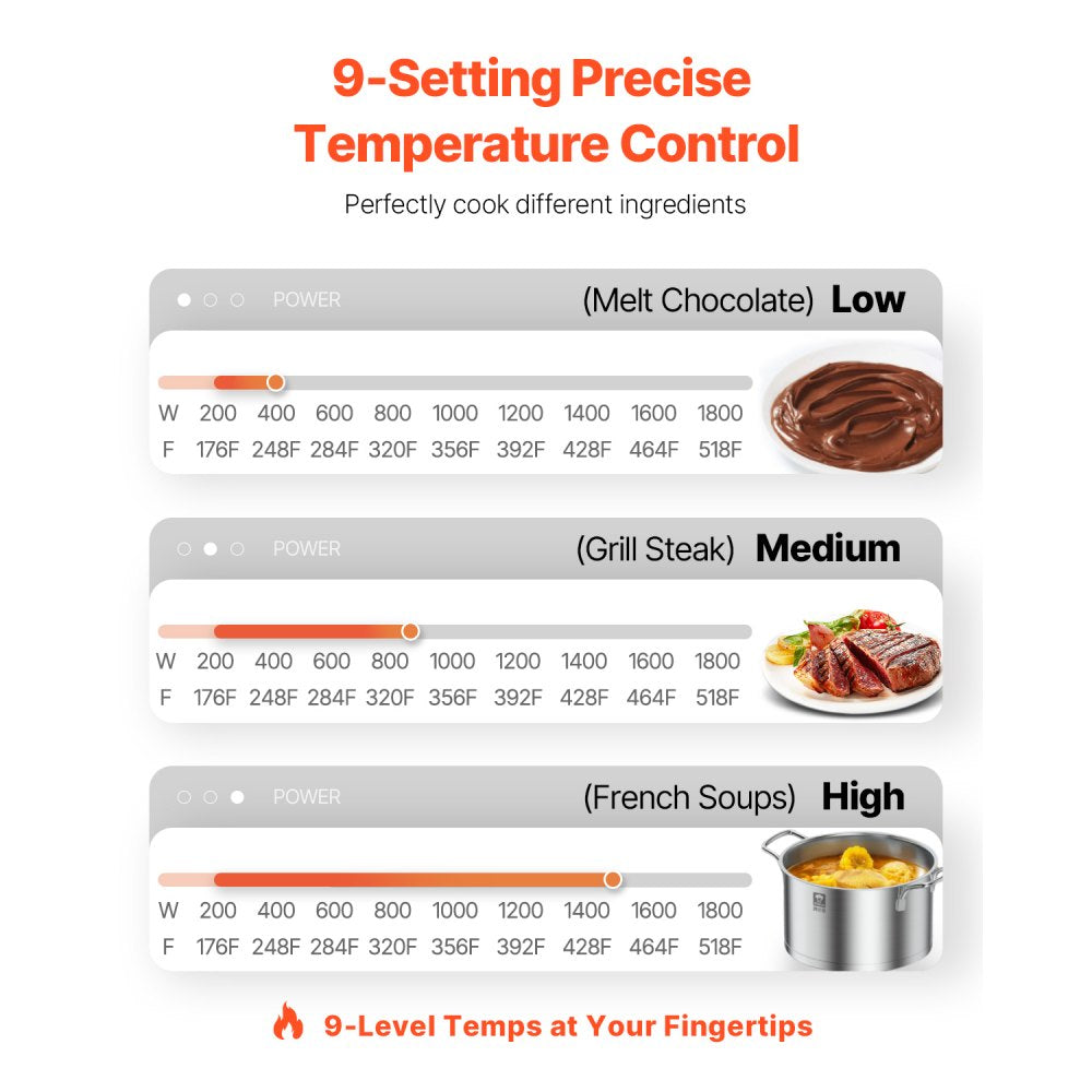 •Efficient Heating with 1800W high-power output and large coil for fast and even heating.
