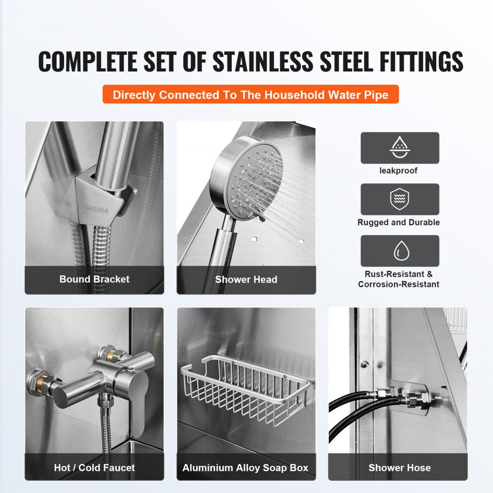 •Durable Stainless Steel Accessories: Includes a stainless steel showerhead, faucet, and bracket, all rust-resistant, plus an aluminum alloy soapbox for long-term storage..