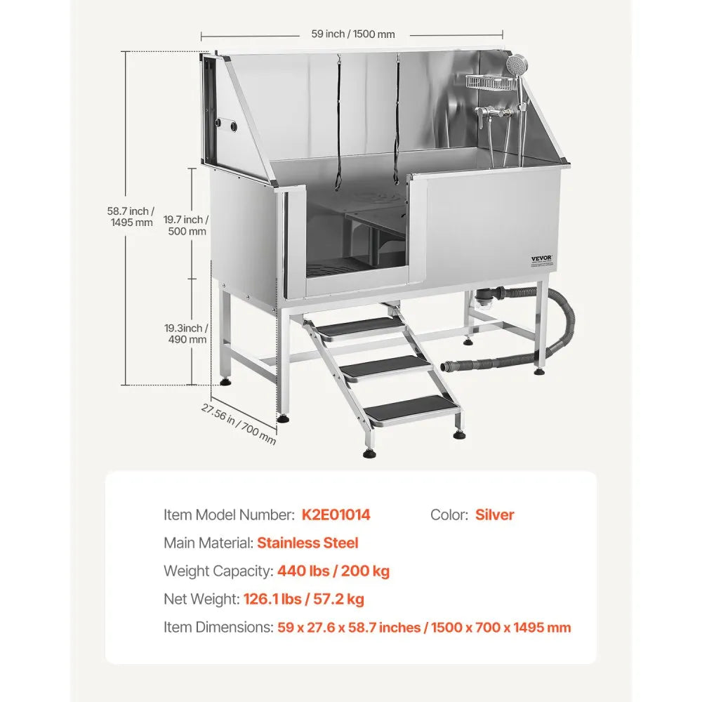 - K2E01014 - 62-Inch Stainless Steel Dog Bath Tub with Anti-Slip Stairs