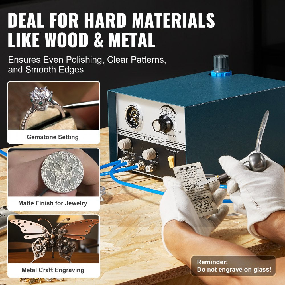 Experience unparalleled engraving capabilities with the VEVOR Pneumatic Engraver, powered by a sturdy 60W DC motor This tool offers adjustable speeds ranging from 1200 to 6000 RPM and operates within an air pressure spectrum of 0-60 PSI, making it ideal for a variety of engraving applications It's particularly effective for engraving on tough materials like metals and stones, making it perfect for tasks such as gemstone setting, intricate jewelry work, and detailed stone designs.