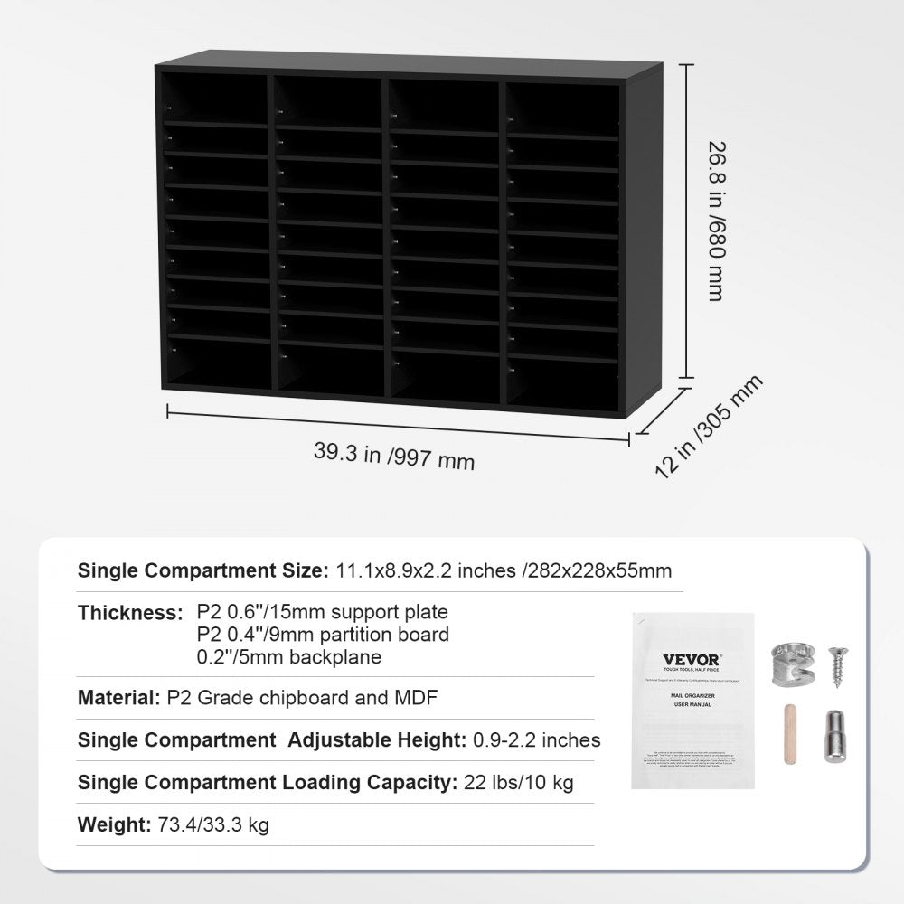 Organize your paperwork effortlessly with the VEVOR Wood Literature Organizer, featuring an impressive design with 36 spacious compartments Crafted from sturdy P2 grade chipboard and MDF, this unit stands the test of time and offers enhanced stability compared to traditional cardboard organizers Eco-conscious buyers will appreciate that the materials used are EPA certified, promoting a healthy environment for both users and the planet.