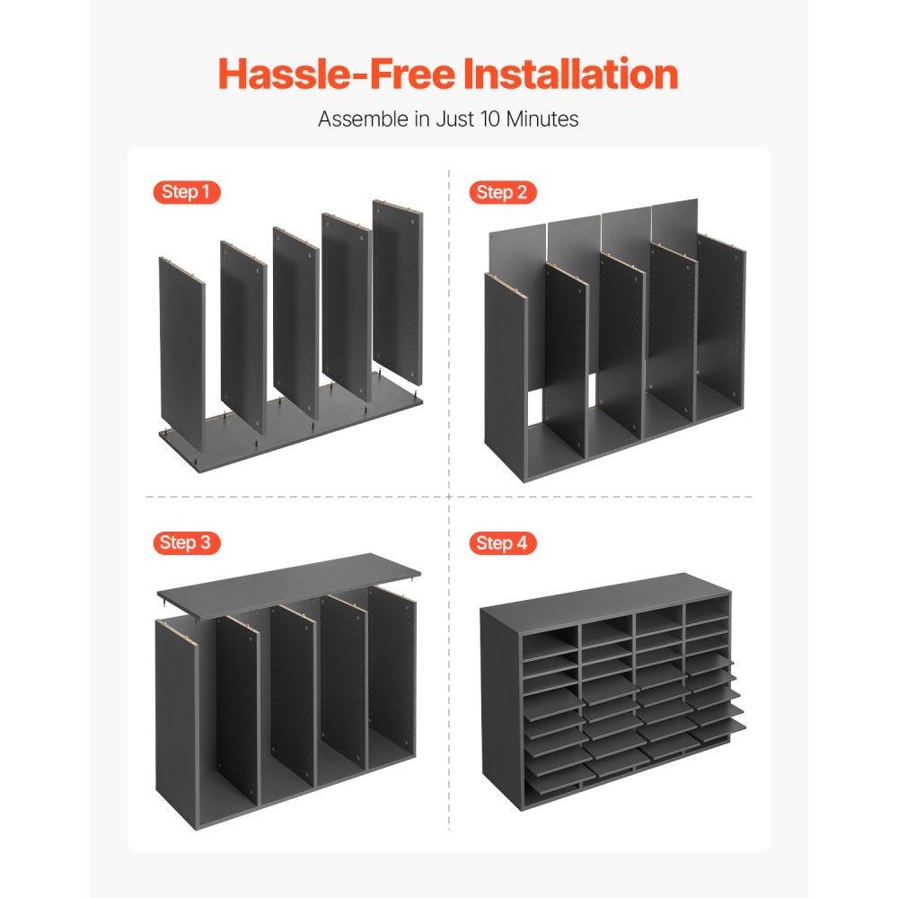 Introducing the VEVOR Literature Organizer, an efficient storage solution featuring 36 generous compartments, arranged in 4 columns and 9 rows This design provides plenty of space for your books, documents, magazines, and other essentials, with clearly labeled sections for quick retrieval Constructed from sturdy P2 particle board and MDF, each shelf can hold up to 22 lbs (10 kg) and meets EPA safety standards.