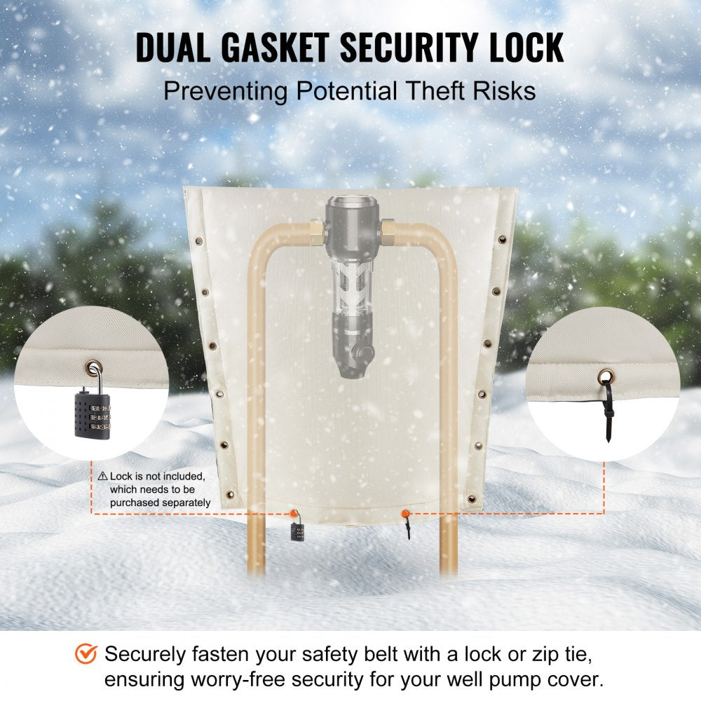 Protect your pump equipment with the VEVOR well pump cover, engineered to withstand temperature fluctuations in both residential and agricultural settings Made from tough 600D PVC Oxford polyester, this cover promises long-lasting durability Its innovative extra-wide Velcro fastening system ensures a secure fit, so the cover stays in place Additionally, it features dual anti-theft gaskets compatible with locks or straps, enhancing its security against theft.
