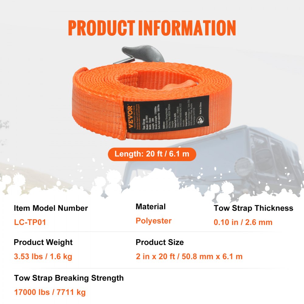 - LC-TP01 - Heavy-Duty 2"x20' Tow Strap with Hooks for Safe Recovery