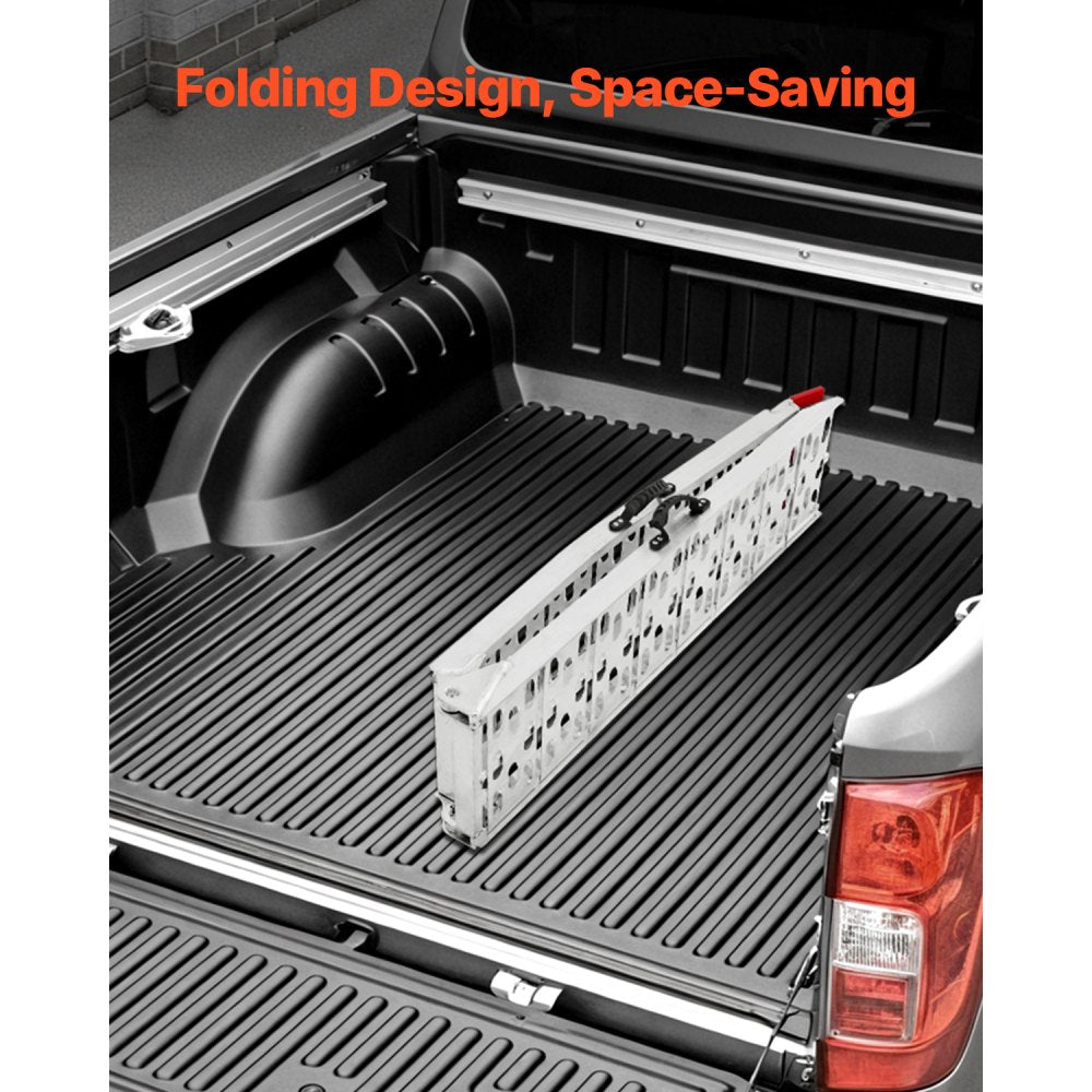 •Quick Folding Design: The ramp folds and unfolds within 1 second, featuring reinforced triangular joints for smooth operation. A rubber handle makes it easy to carry, and its compact design fits conveniently in garages or car trunks without taking up much space..